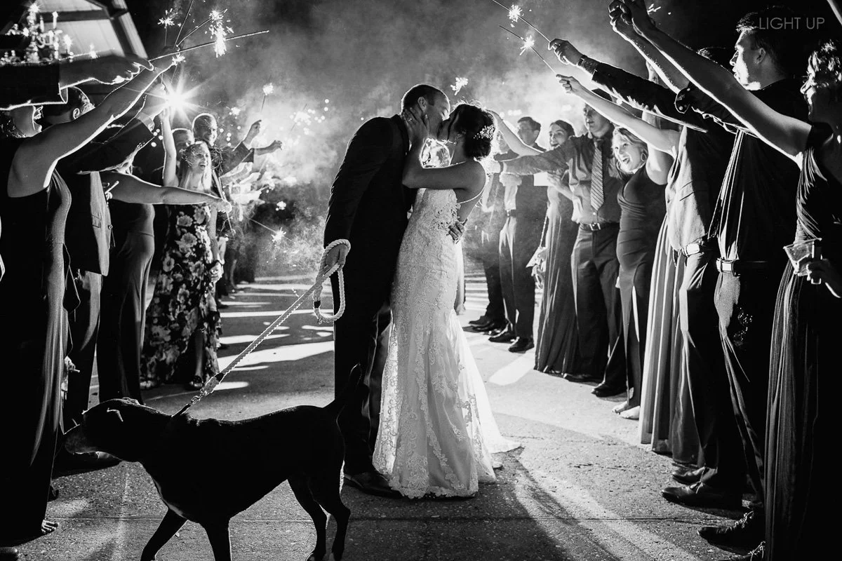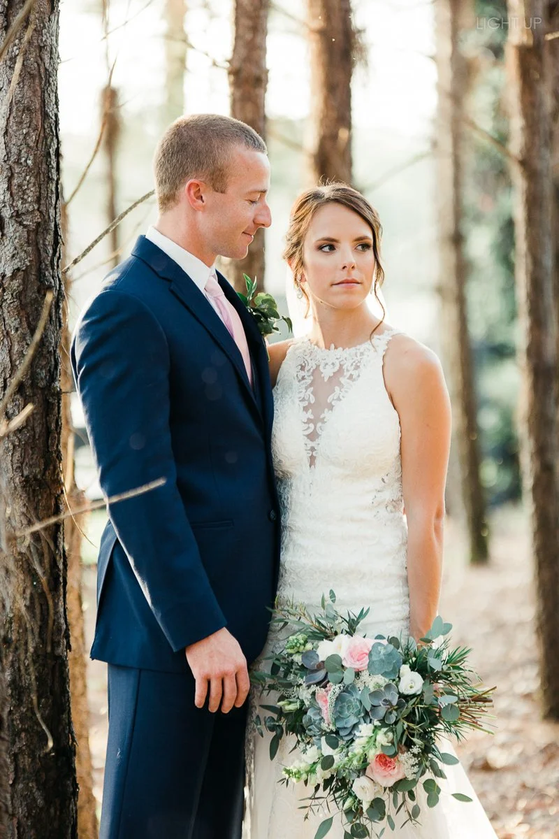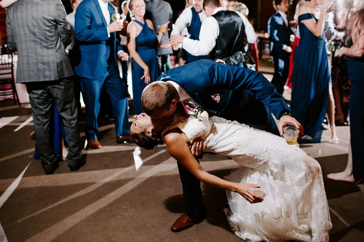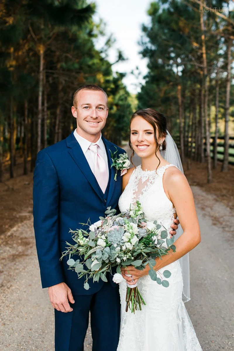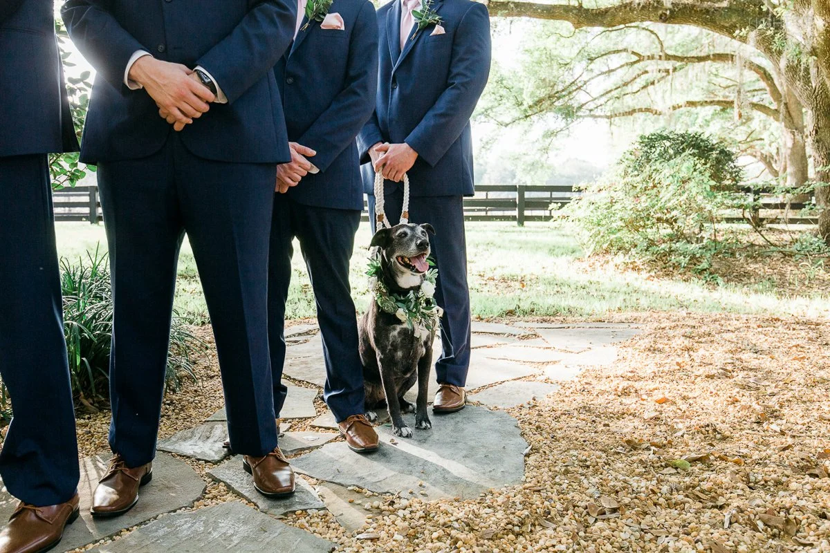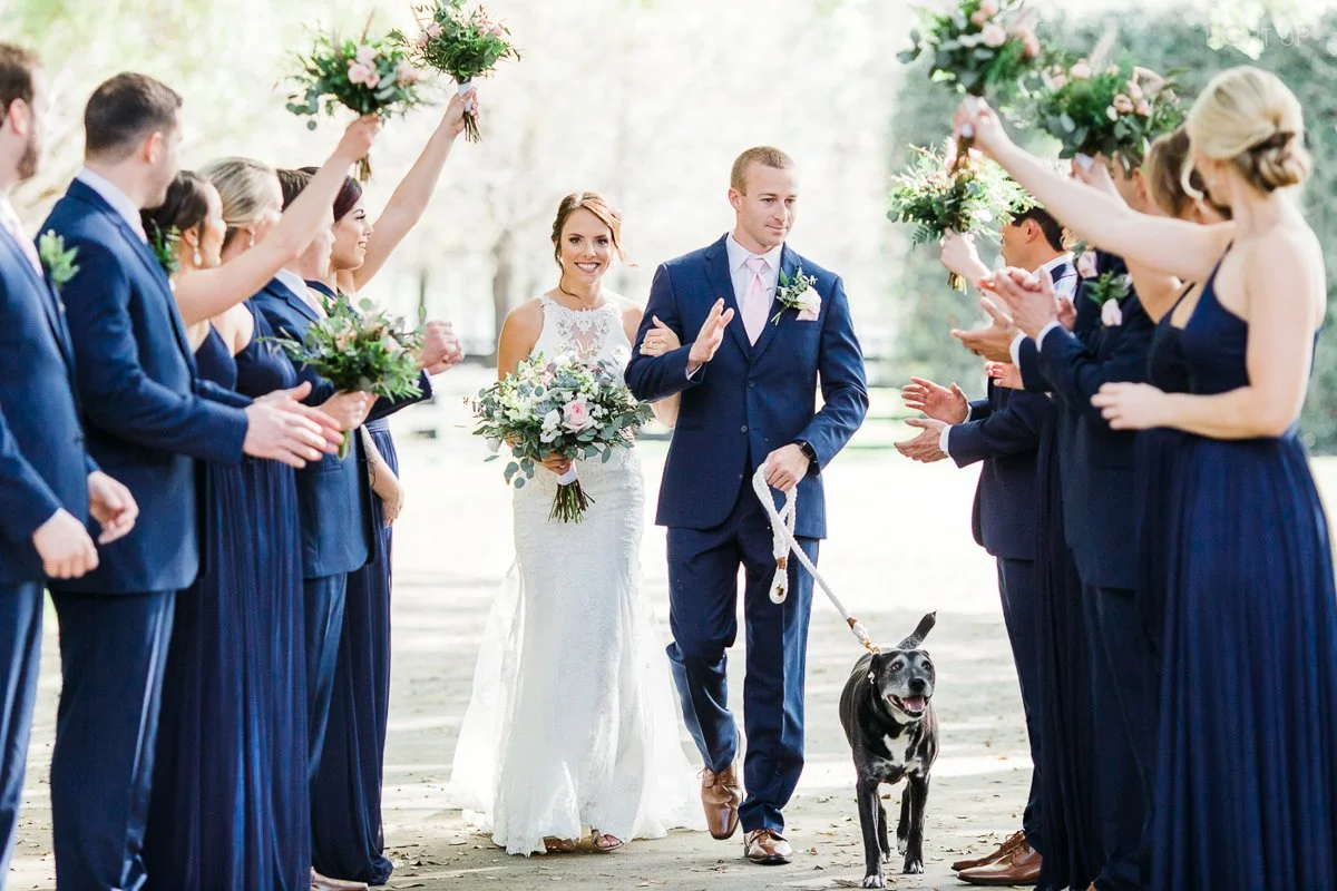 Amanda wore a stunning wedding dress with a beautiful bouquet and Tyler wore a classic blue suit. The groomsmen and bridesmaids were also dressed in blue, and they included their sweet dog in the bridal party (see photos below).