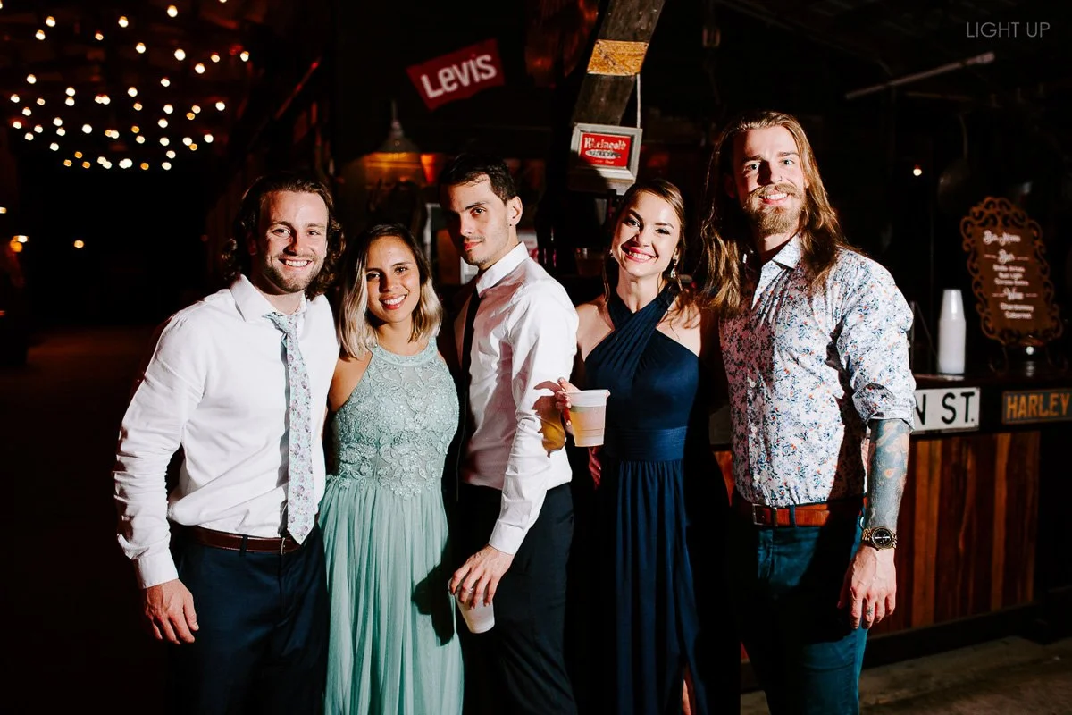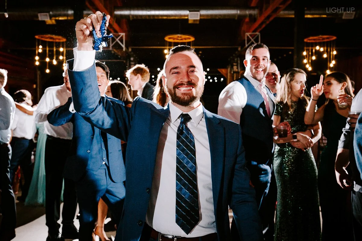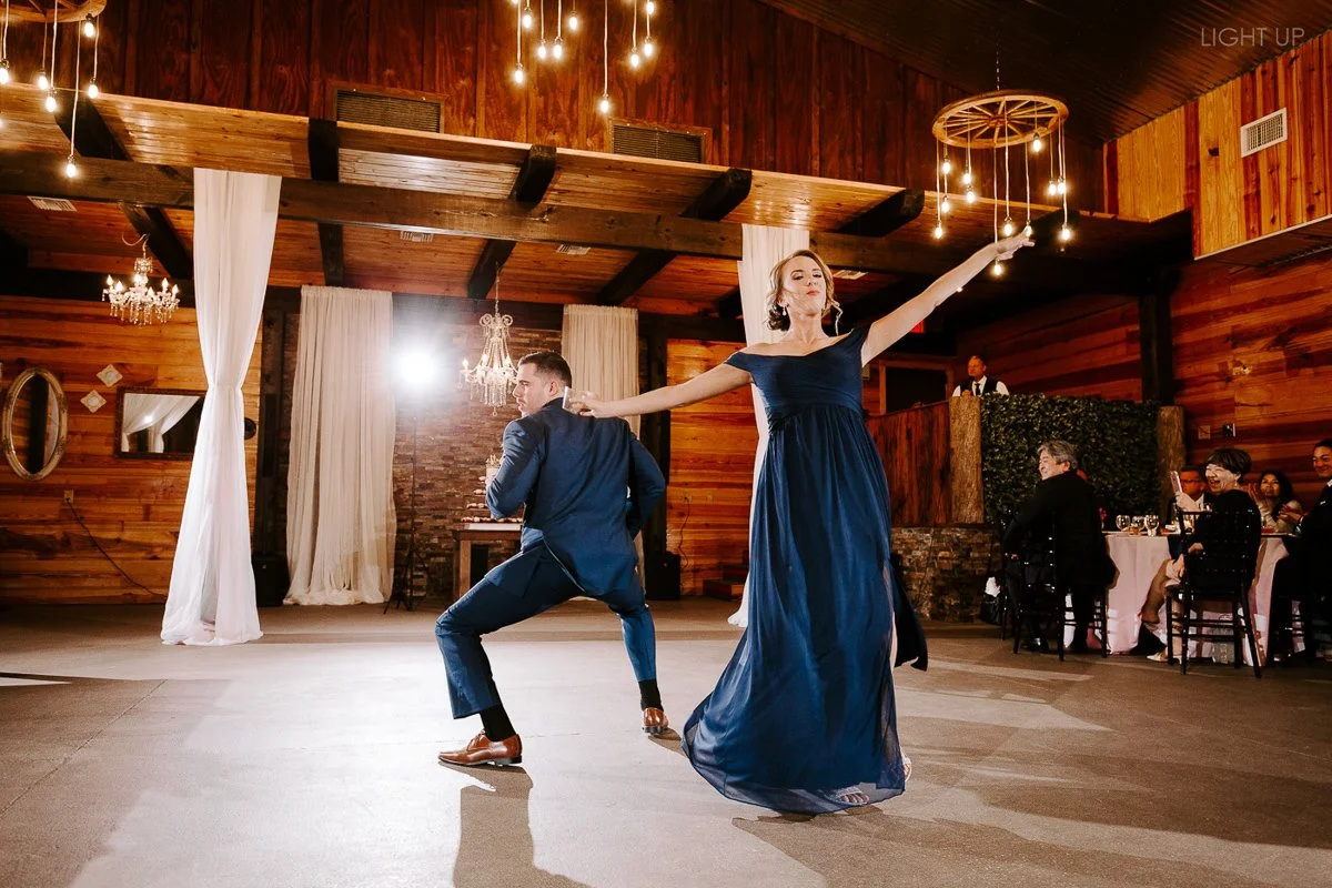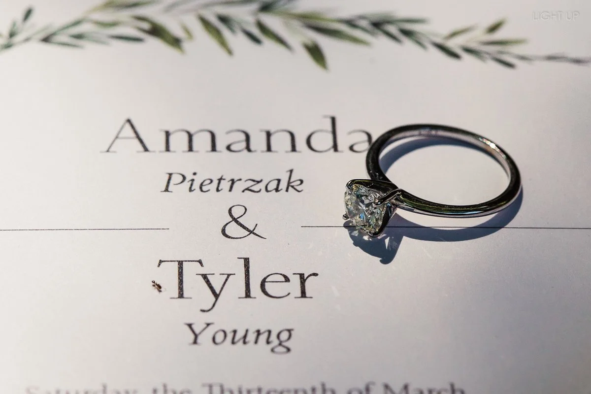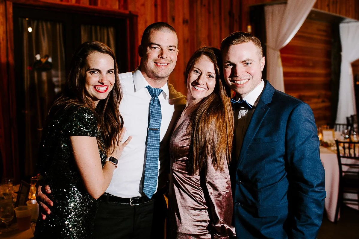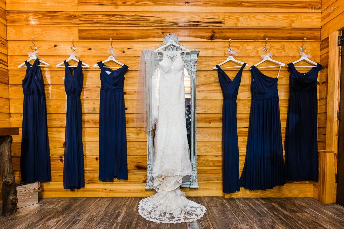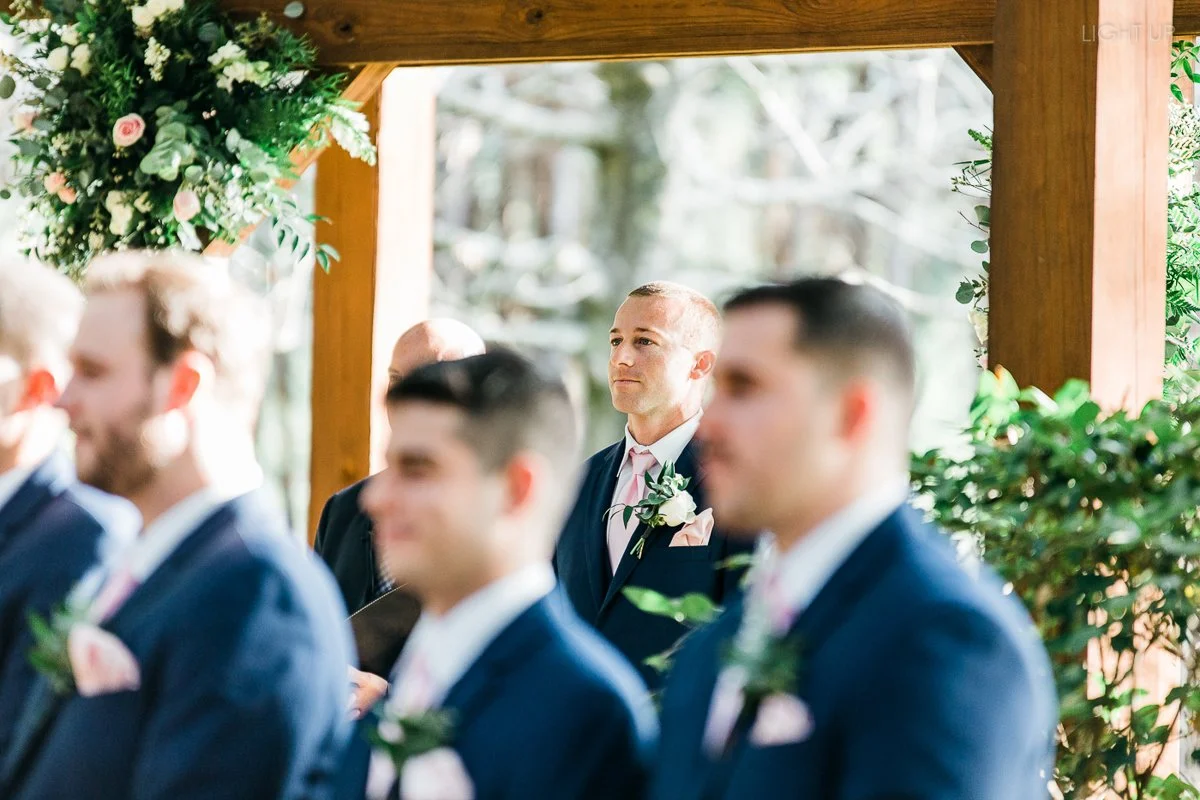 Amanda wore a stunning wedding dress with a beautiful bouquet and Tyler wore a classic blue suit. The groomsmen and bridesmaids were also dressed in blue, and they included their sweet dog in the bridal party (see photos below).