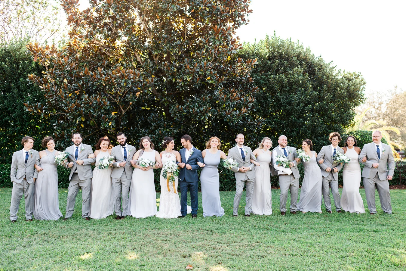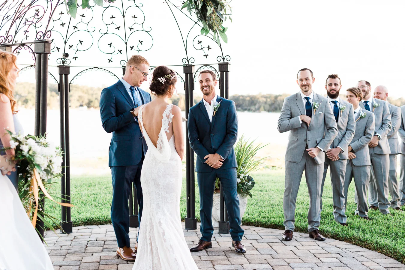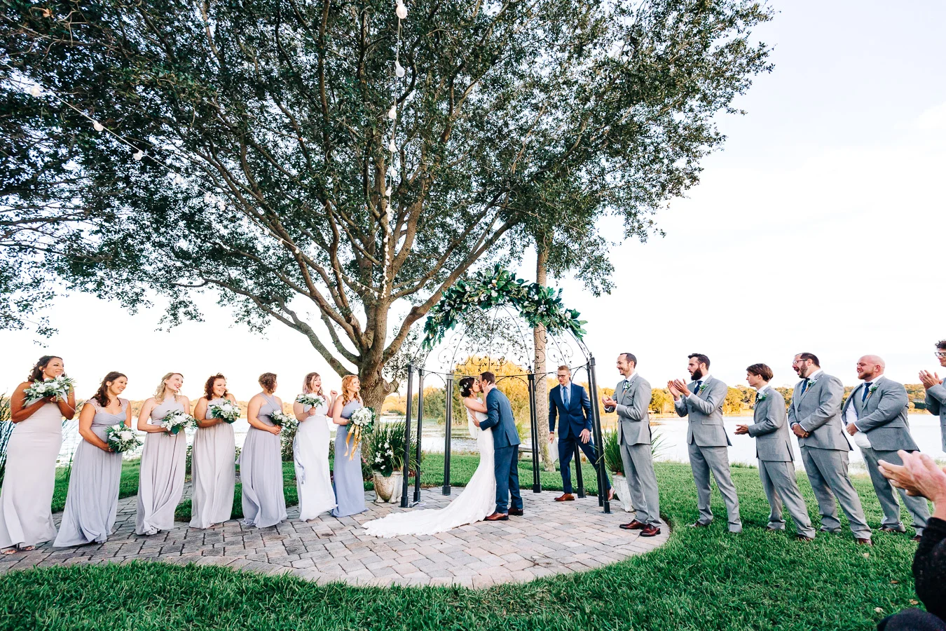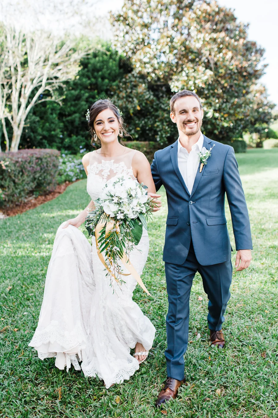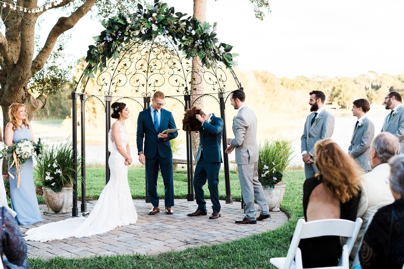 This wedding took place on a private property in Mount Dora that had a gorgeous lawn lined up with a beautiful hedge and trees. When we do a first-look; we simply positioned the groom where we know we are going to capture beautiful photos because the background is free of distractions and the lighting is coming from the best angle. Once we give the bride the “go ahead” nod, we try to stay out of the way to let the moment unfold organically as we watch and document it with our cameras. We don’t interrupt this moment or stage any movements, because this is a real moment charged with real emotion. And just like that, the first-look is over in a few blinks. For many couples, this moment takes a lot of pressure off from all the planning leading up to this day, so it’s only natural that the portraits to follow will be a lot of fun for the bride and groom. In this case, Robin and Tom did made it easy for us to photograph stunning wedding photos around the property followed by the bridal party photos and family portraits.