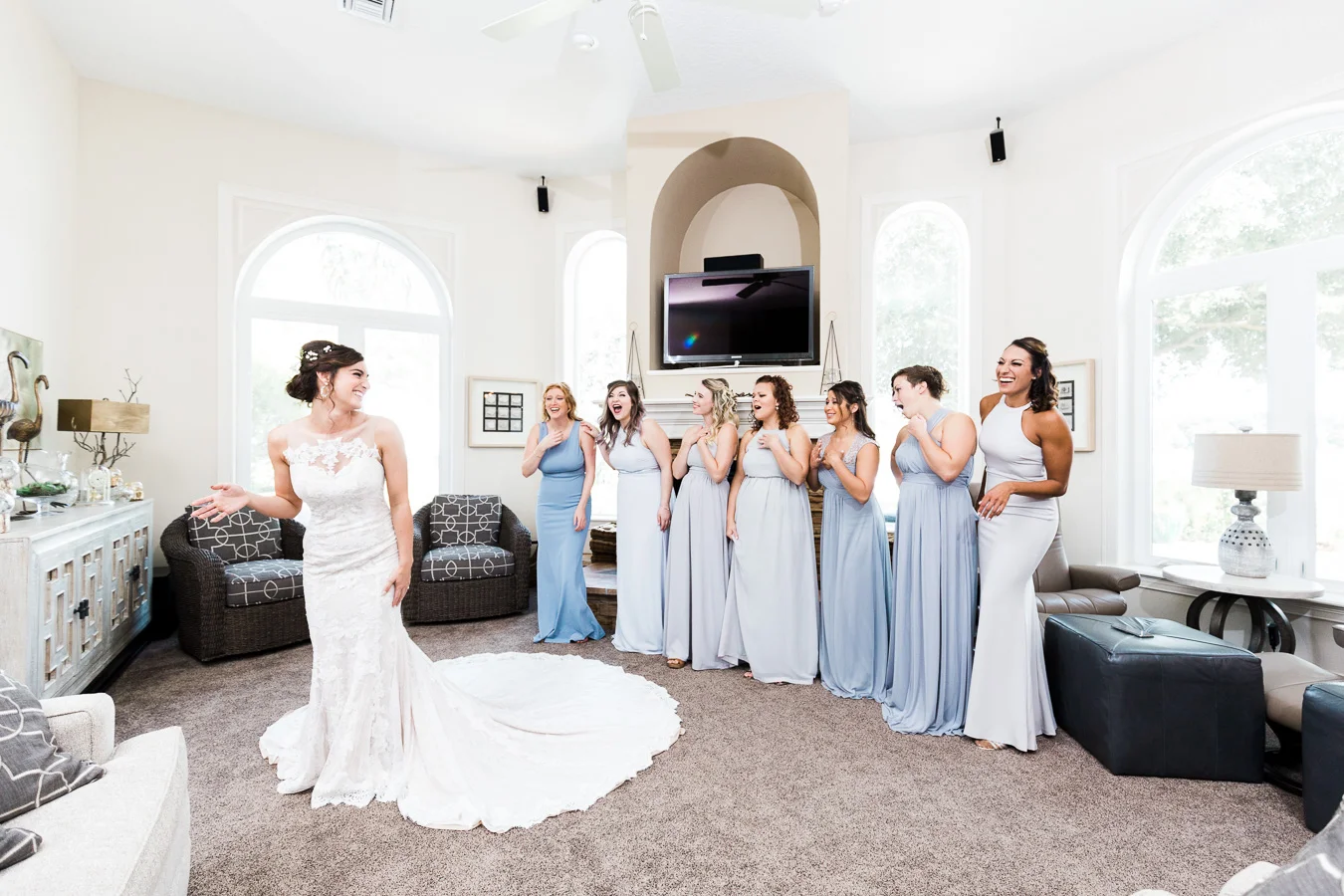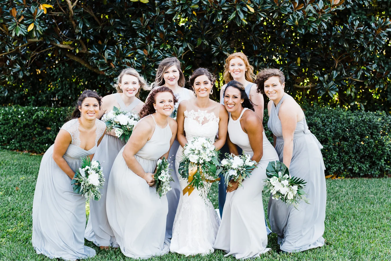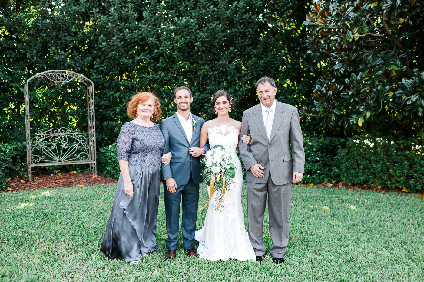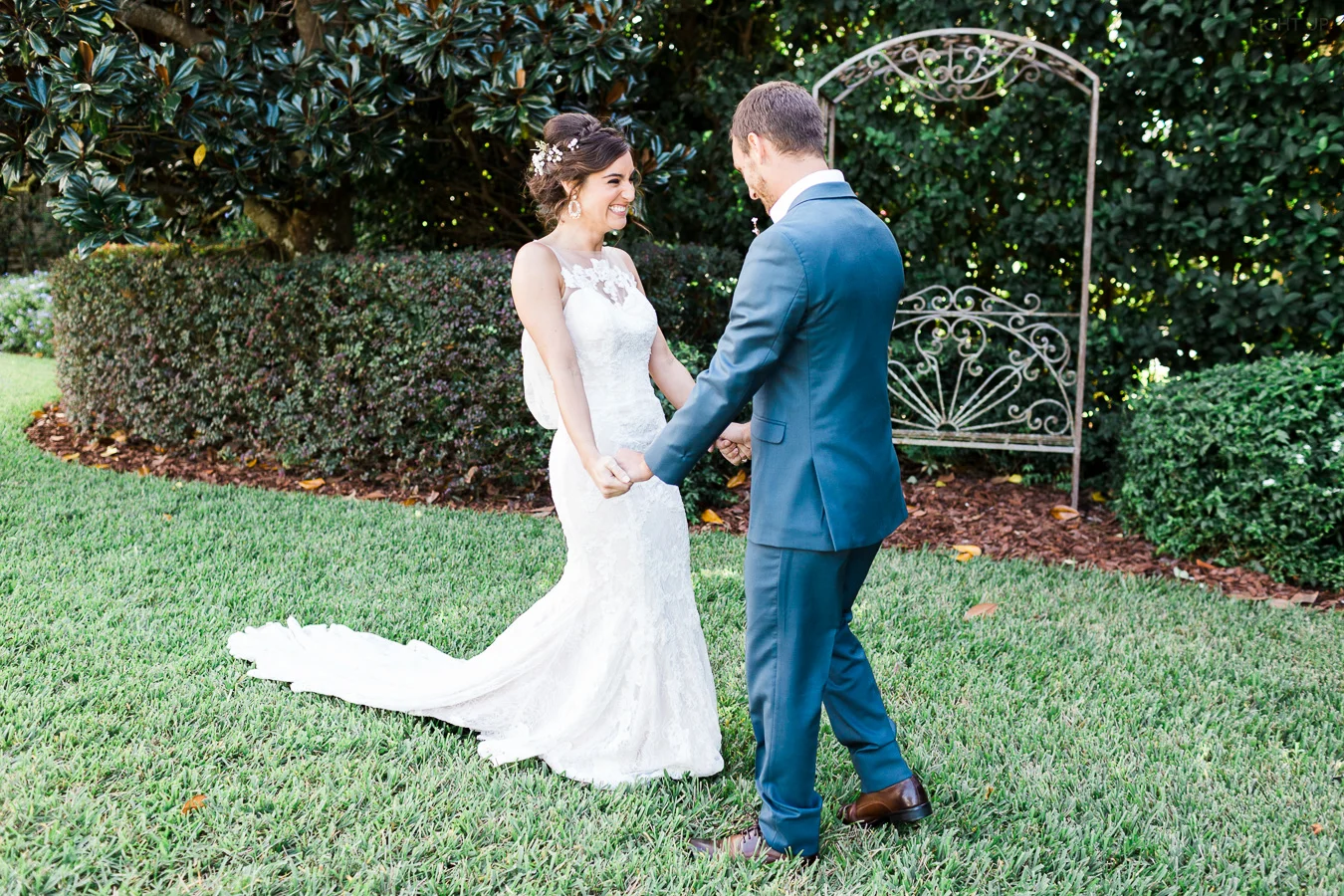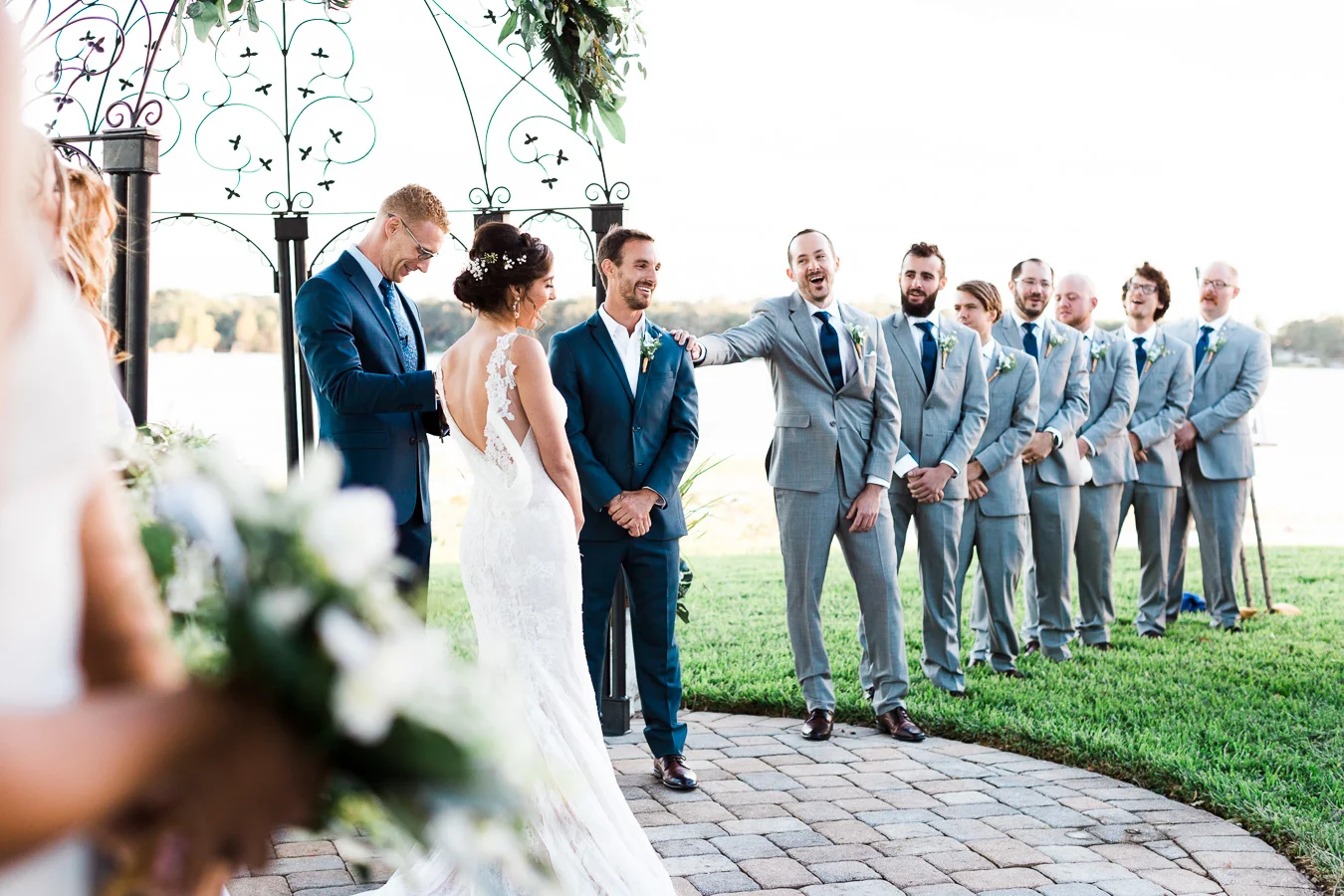 This wedding took place on a private property in Mount Dora that had a gorgeous lawn lined up with a beautiful hedge and trees. When we do a first-look; we simply positioned the groom where we know we are going to capture beautiful photos because the background is free of distractions and the lighting is coming from the best angle. Once we give the bride the “go ahead” nod, we try to stay out of the way to let the moment unfold organically as we watch and document it with our cameras. We don’t interrupt this moment or stage any movements, because this is a real moment charged with real emotion. And just like that, the first-look is over in a few blinks. For many couples, this moment takes a lot of pressure off from all the planning leading up to this day, so it’s only natural that the portraits to follow will be a lot of fun for the bride and groom. In this case, Robin and Tom did made it easy for us to photograph stunning wedding photos around the property followed by the bridal party photos and family portraits.