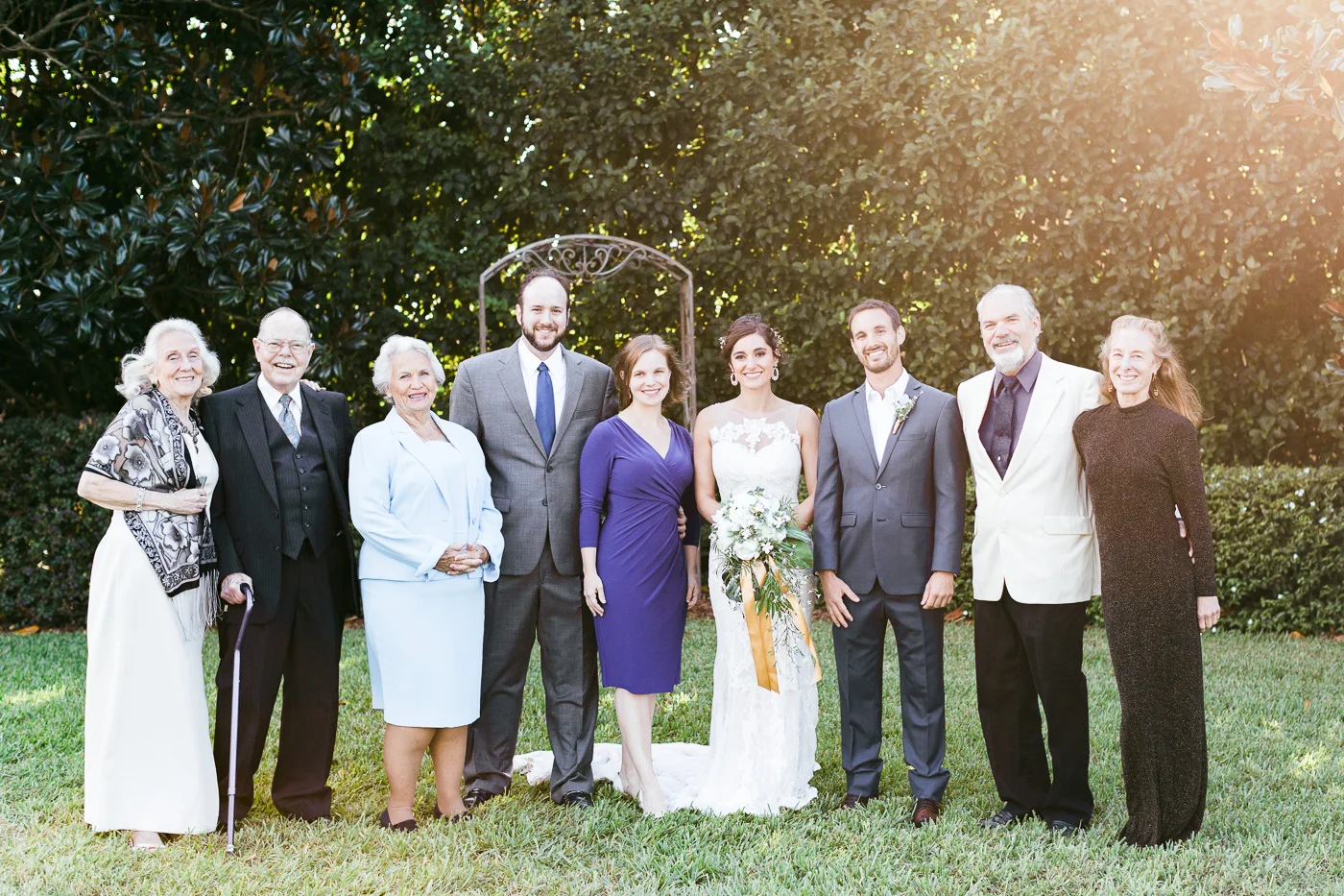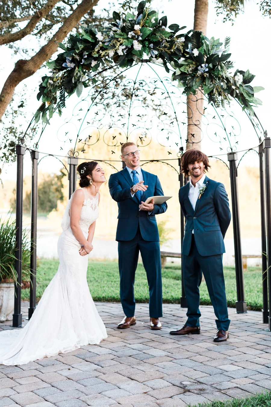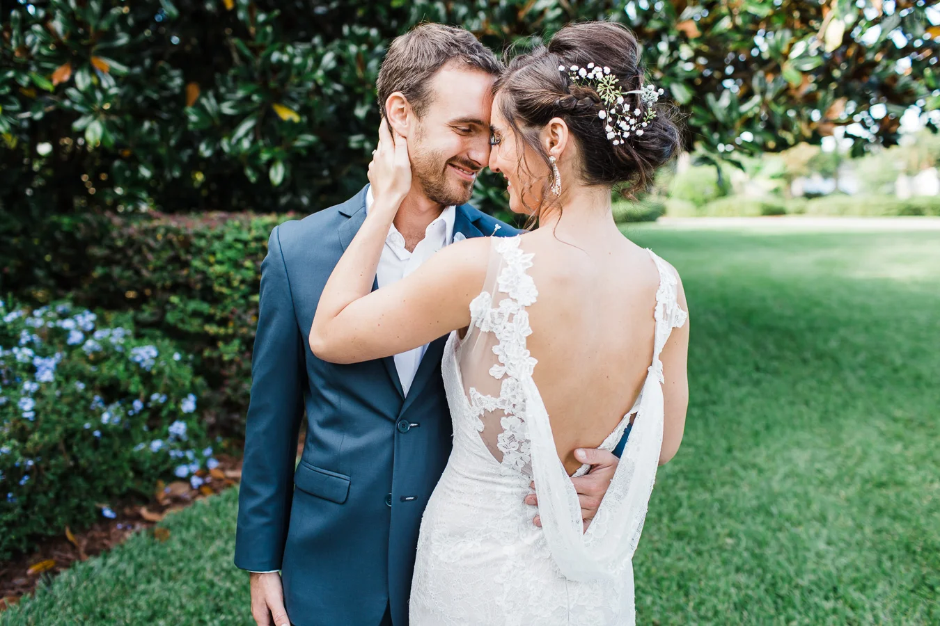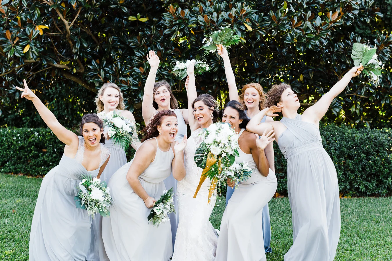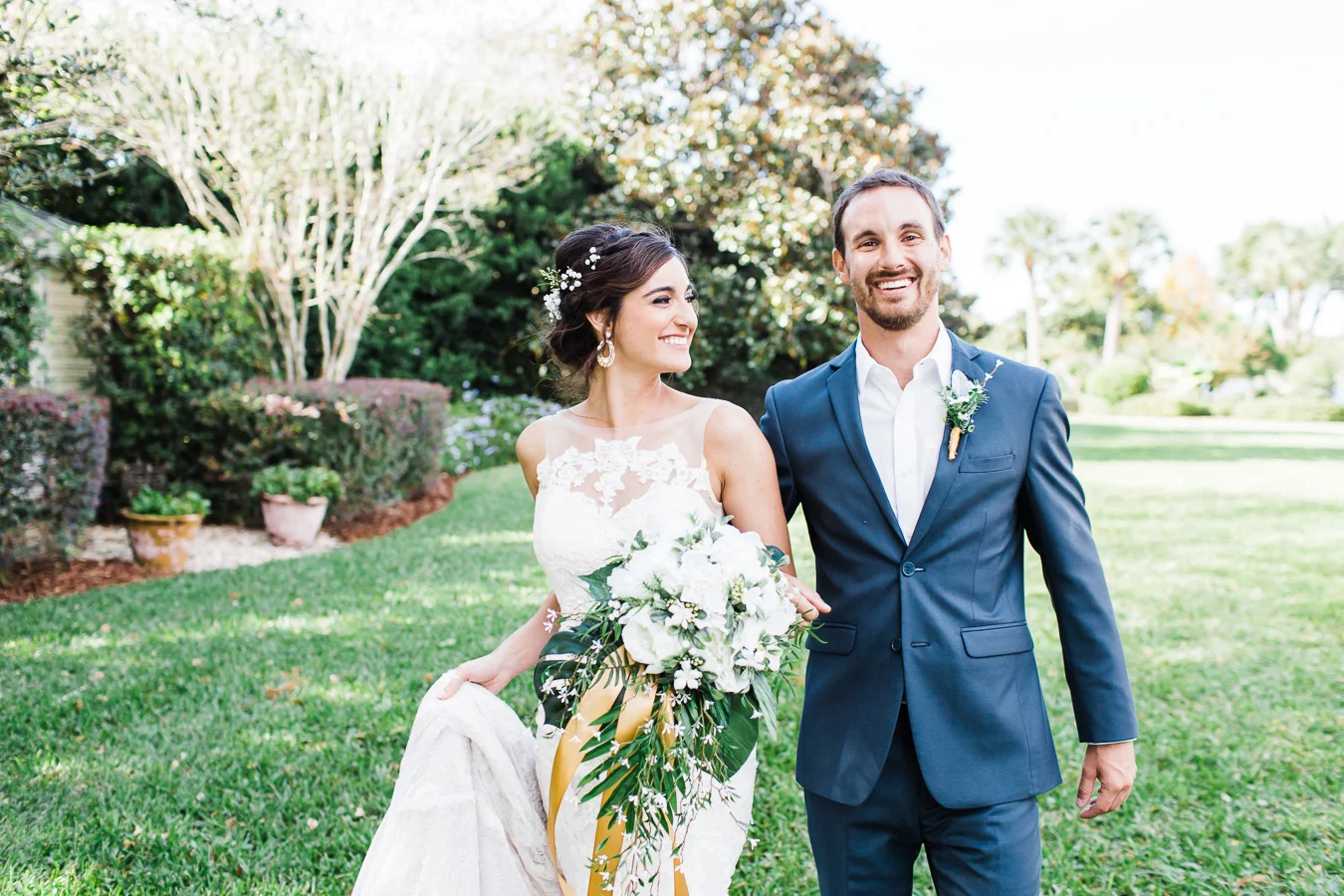 This wedding took place on a private property in Mount Dora that had a gorgeous lawn lined up with a beautiful hedge and trees. When we do a first-look; we simply positioned the groom where we know we are going to capture beautiful photos because the background is free of distractions and the lighting is coming from the best angle. Once we give the bride the “go ahead” nod, we try to stay out of the way to let the moment unfold organically as we watch and document it with our cameras. We don’t interrupt this moment or stage any movements, because this is a real moment charged with real emotion. And just like that, the first-look is over in a few blinks. For many couples, this moment takes a lot of pressure off from all the planning leading up to this day, so it’s only natural that the portraits to follow will be a lot of fun for the bride and groom. In this case, Robin and Tom did made it easy for us to photograph stunning wedding photos around the property followed by the bridal party photos and family portraits.