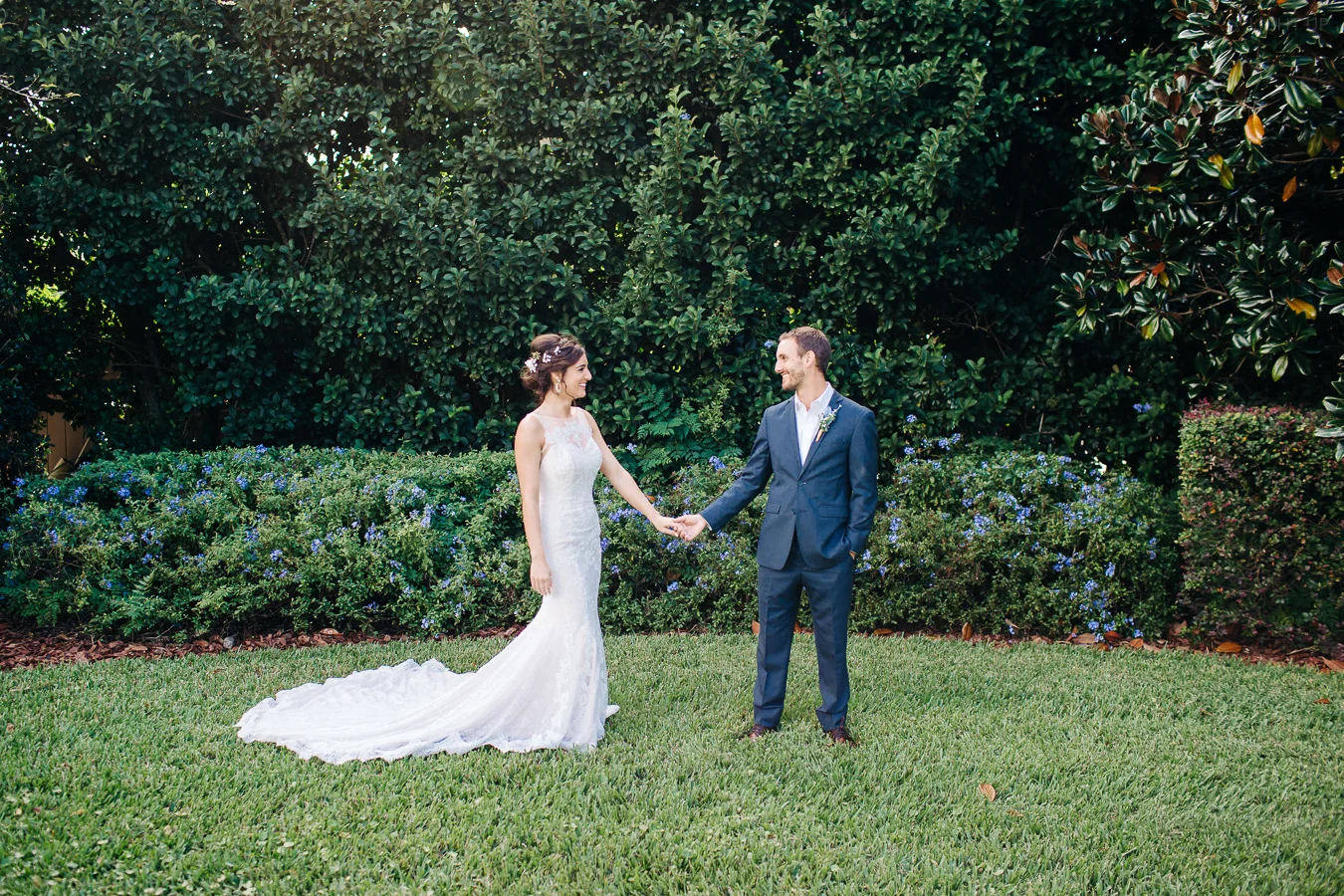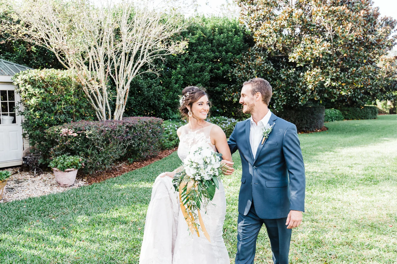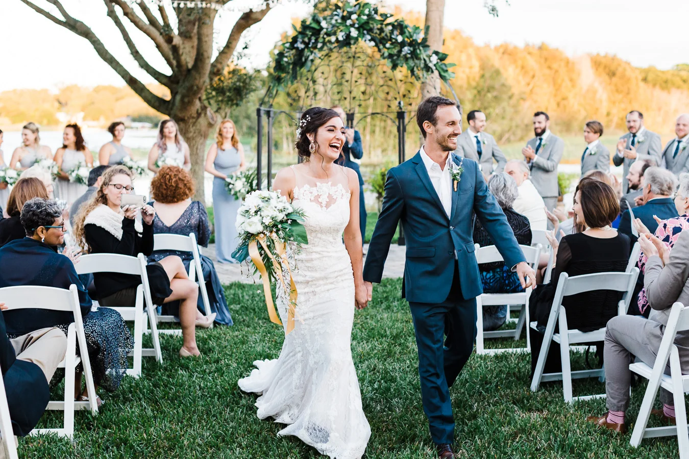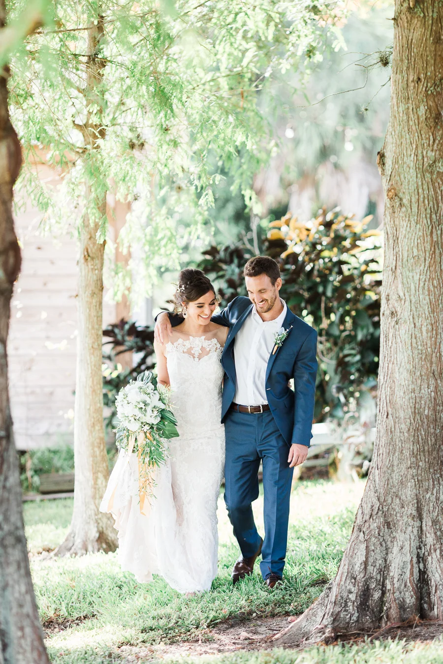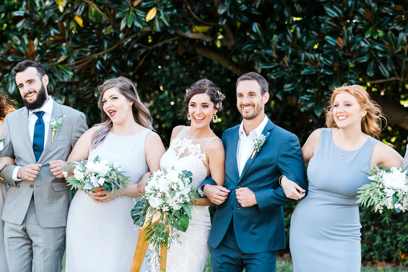 This wedding took place on a private property in Mount Dora that had a gorgeous lawn lined up with a beautiful hedge and trees. When we do a first-look; we simply positioned the groom where we know we are going to capture beautiful photos because the background is free of distractions and the lighting is coming from the best angle. Once we give the bride the “go ahead” nod, we try to stay out of the way to let the moment unfold organically as we watch and document it with our cameras. We don’t interrupt this moment or stage any movements, because this is a real moment charged with real emotion. And just like that, the first-look is over in a few blinks. For many couples, this moment takes a lot of pressure off from all the planning leading up to this day, so it’s only natural that the portraits to follow will be a lot of fun for the bride and groom. In this case, Robin and Tom did made it easy for us to photograph stunning wedding photos around the property followed by the bridal party photos and family portraits.