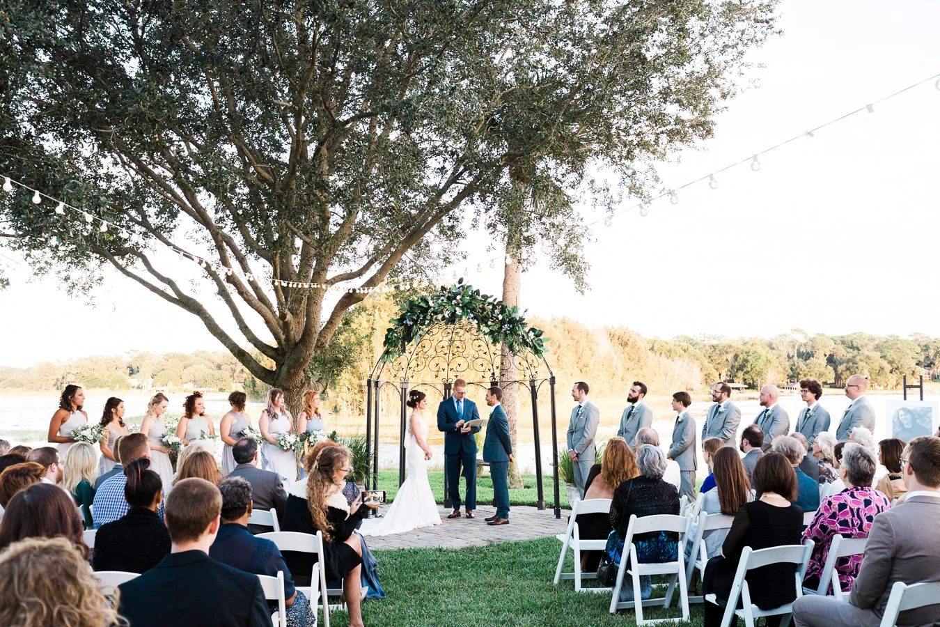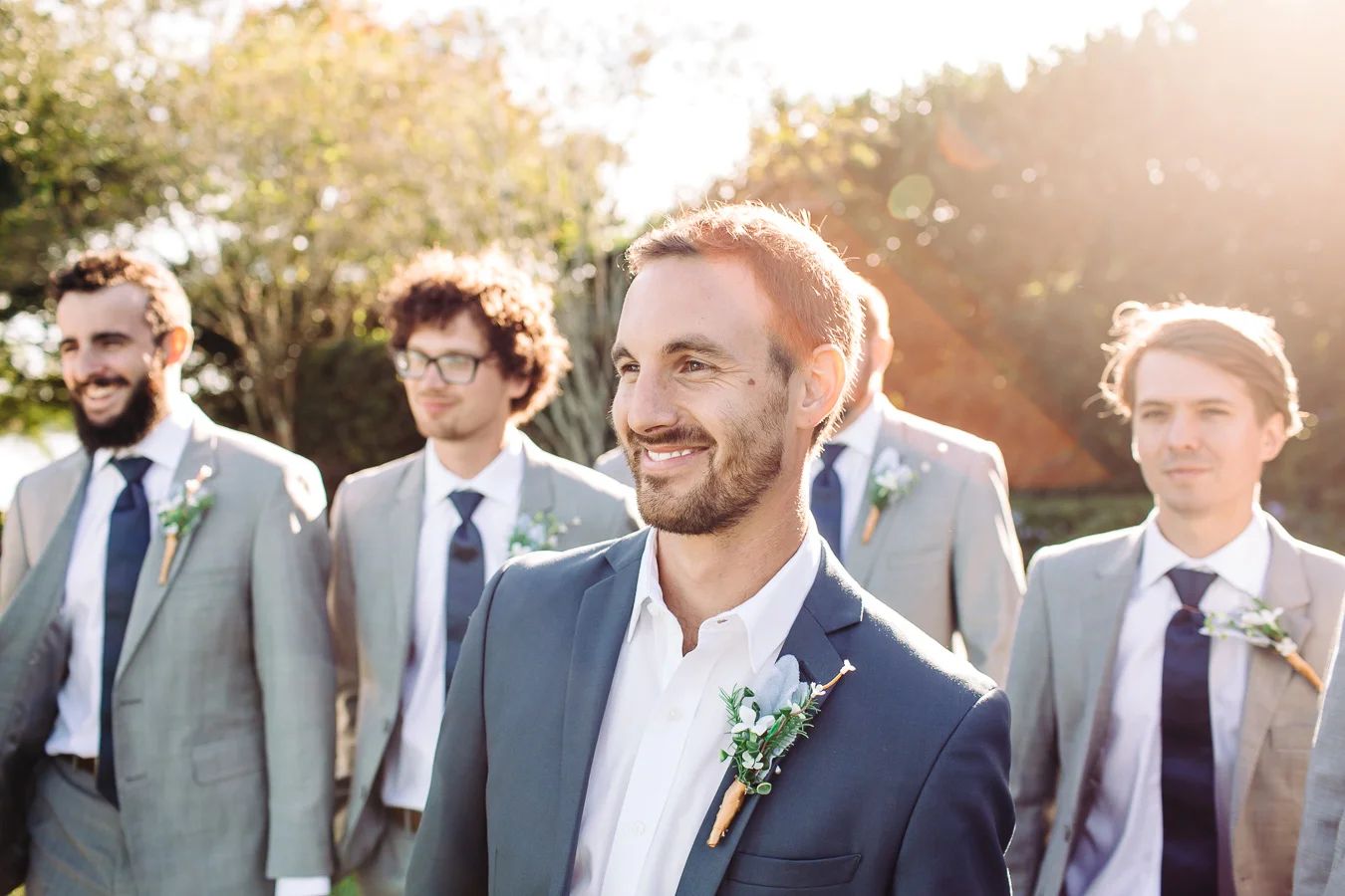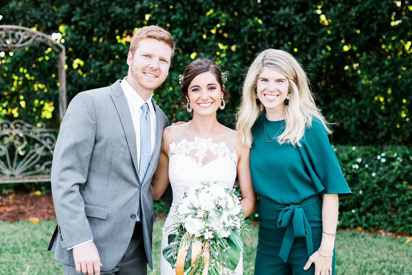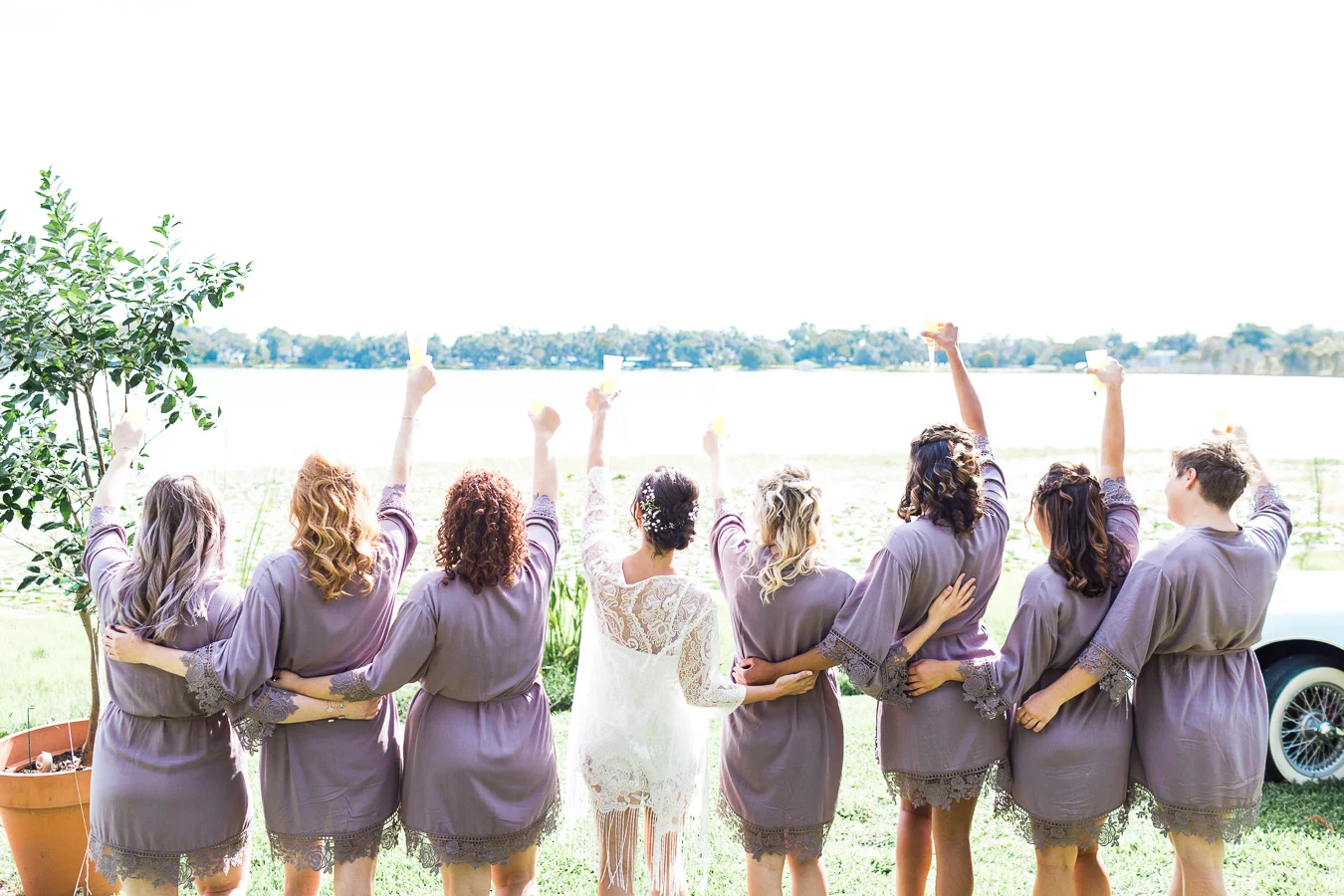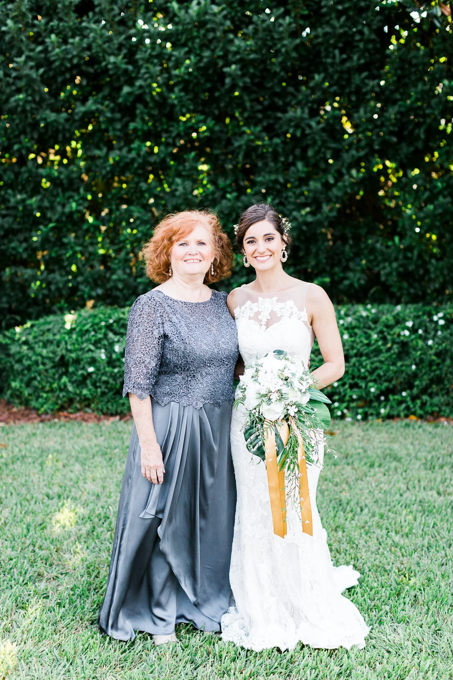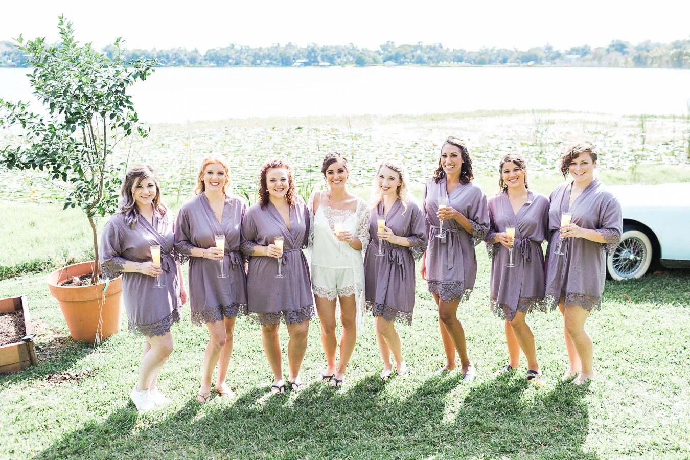 This wedding took place on a private property in Mount Dora that had a gorgeous lawn lined up with a beautiful hedge and trees. When we do a first-look; we simply positioned the groom where we know we are going to capture beautiful photos because the background is free of distractions and the lighting is coming from the best angle. Once we give the bride the “go ahead” nod, we try to stay out of the way to let the moment unfold organically as we watch and document it with our cameras. We don’t interrupt this moment or stage any movements, because this is a real moment charged with real emotion. And just like that, the first-look is over in a few blinks. For many couples, this moment takes a lot of pressure off from all the planning leading up to this day, so it’s only natural that the portraits to follow will be a lot of fun for the bride and groom. In this case, Robin and Tom did made it easy for us to photograph stunning wedding photos around the property followed by the bridal party photos and family portraits.