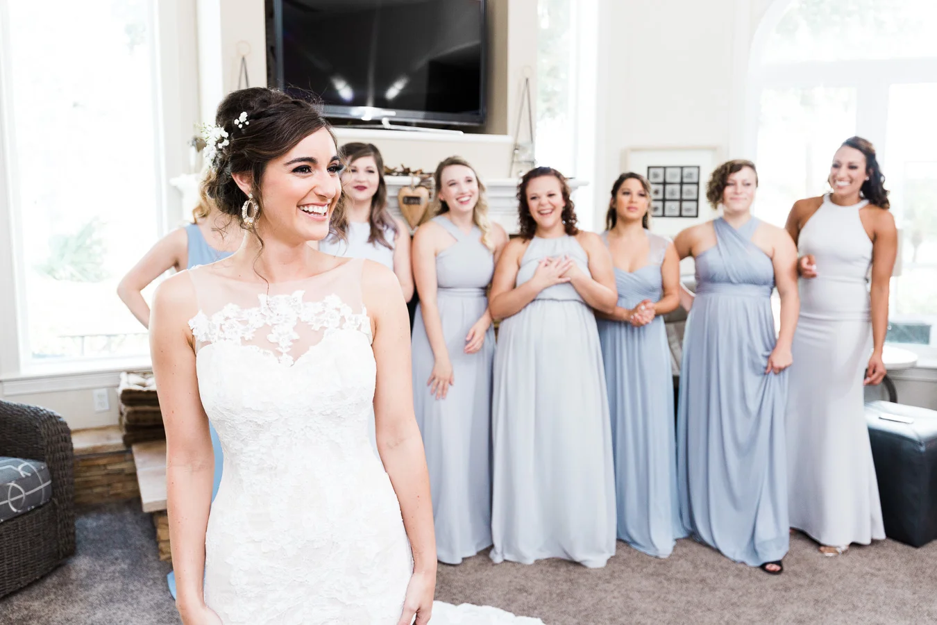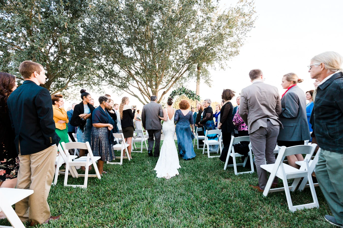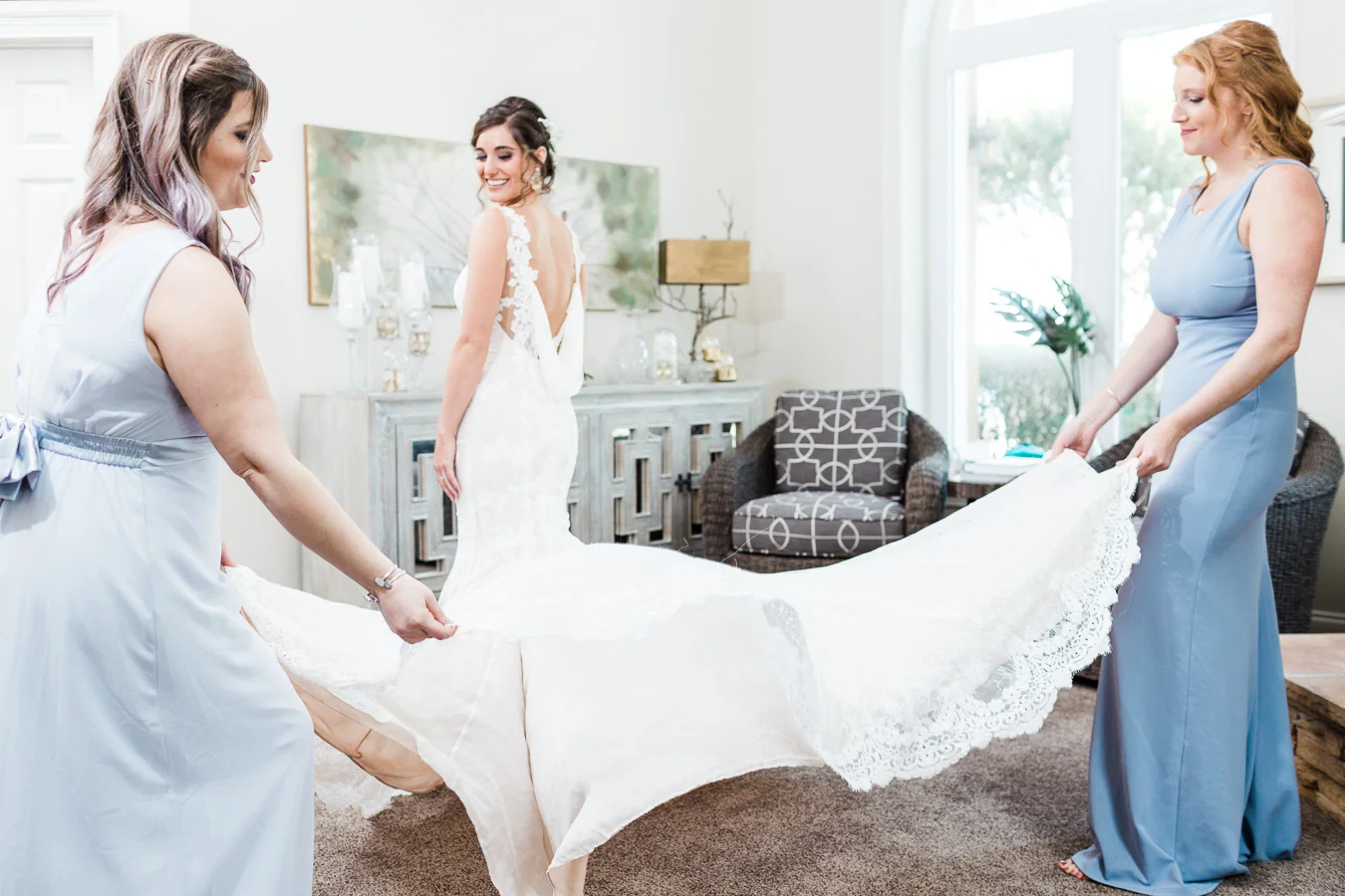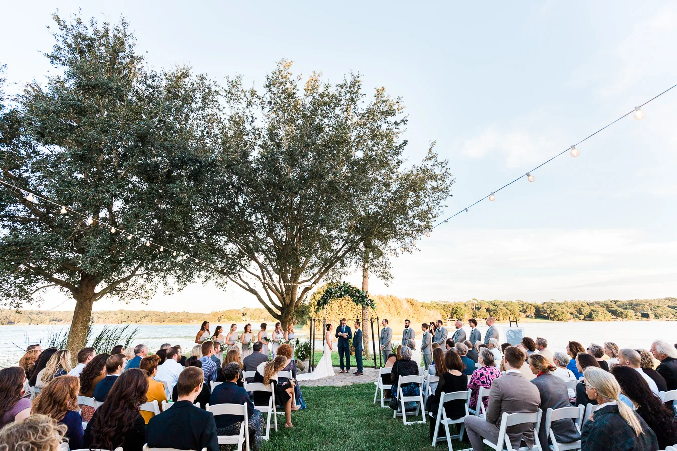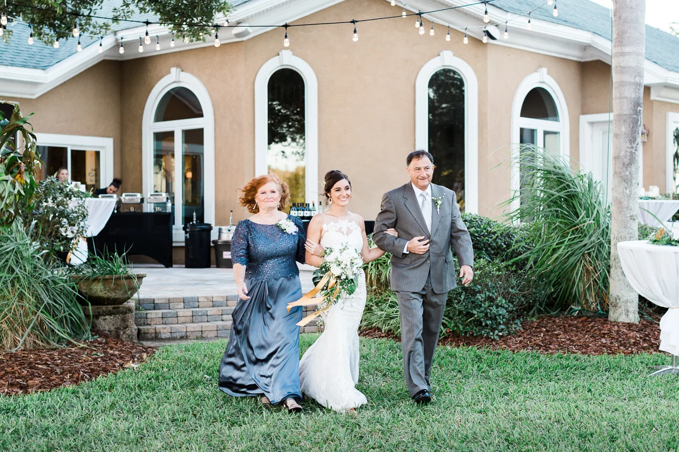 This wedding took place on a private property in Mount Dora that had a gorgeous lawn lined up with a beautiful hedge and trees. When we do a first-look; we simply positioned the groom where we know we are going to capture beautiful photos because the background is free of distractions and the lighting is coming from the best angle. Once we give the bride the “go ahead” nod, we try to stay out of the way to let the moment unfold organically as we watch and document it with our cameras. We don’t interrupt this moment or stage any movements, because this is a real moment charged with real emotion. And just like that, the first-look is over in a few blinks. For many couples, this moment takes a lot of pressure off from all the planning leading up to this day, so it’s only natural that the portraits to follow will be a lot of fun for the bride and groom. In this case, Robin and Tom did made it easy for us to photograph stunning wedding photos around the property followed by the bridal party photos and family portraits.
