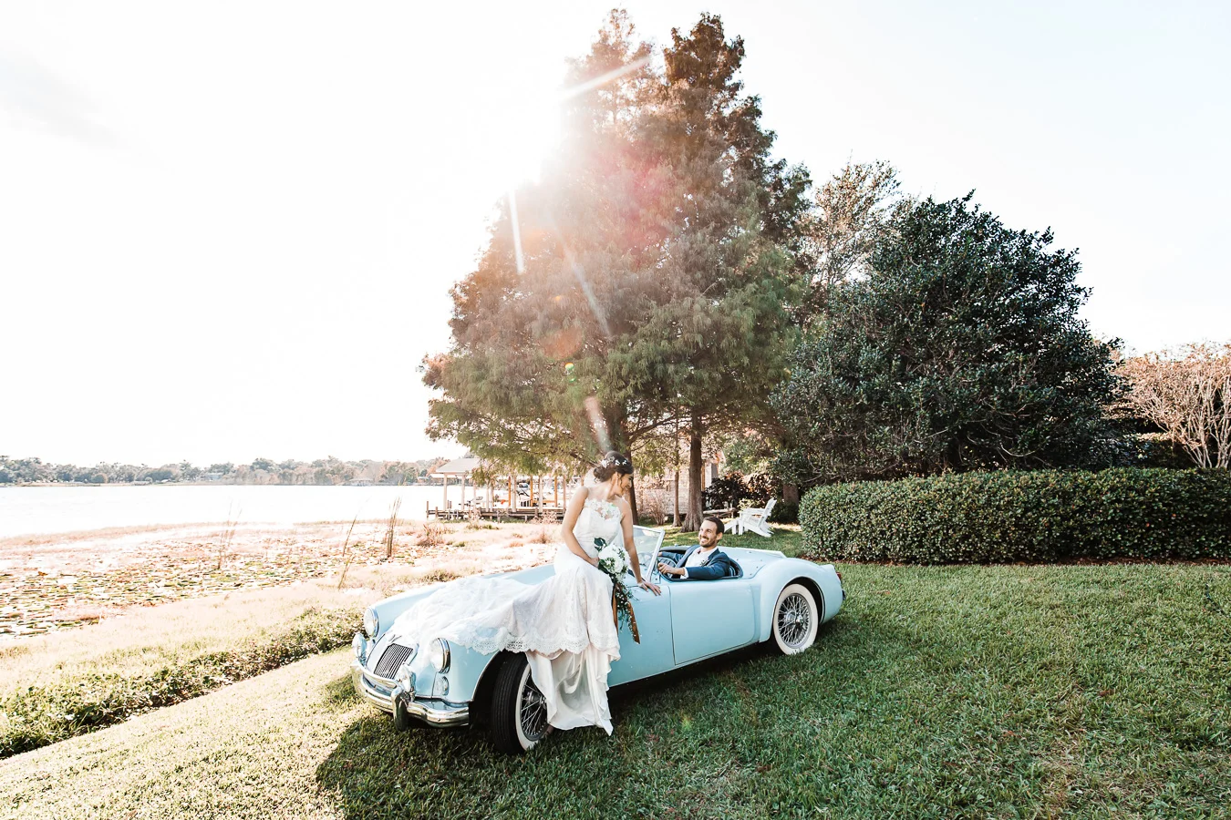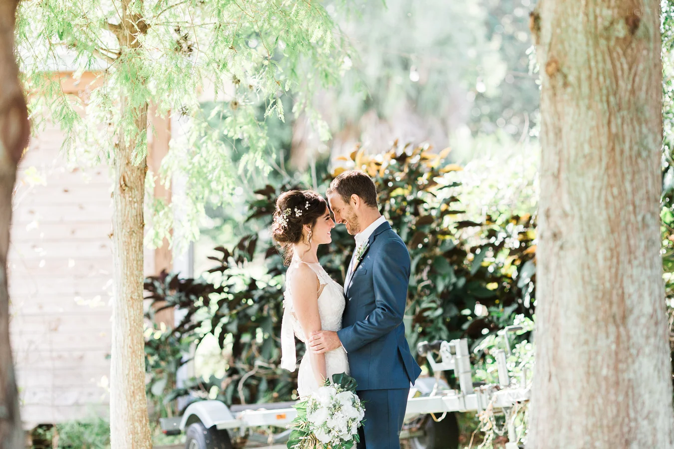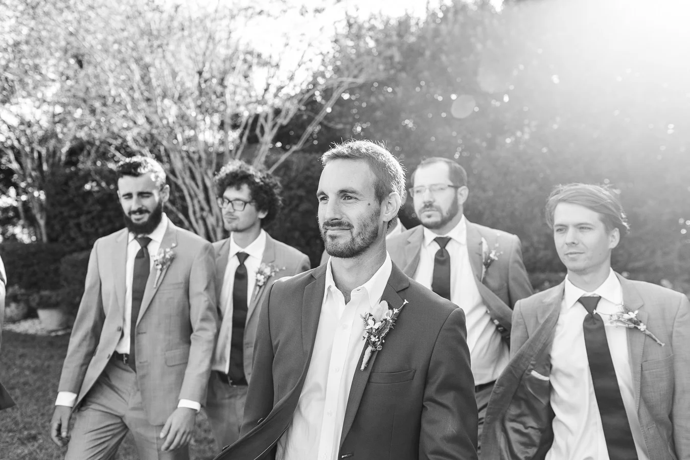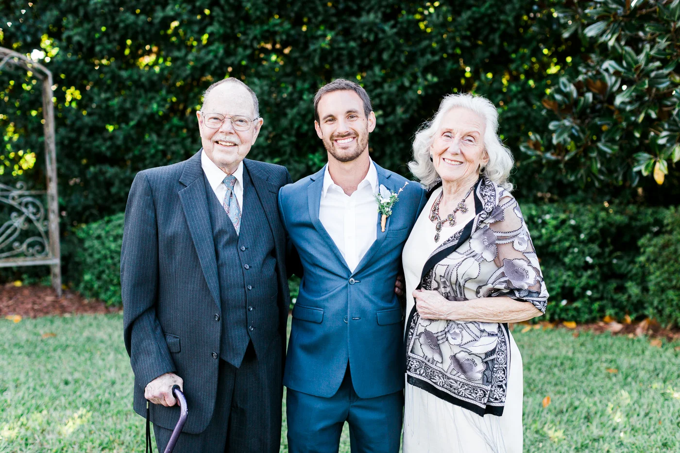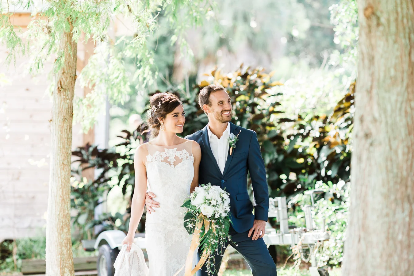 This wedding took place on a private property in Mount Dora that had a gorgeous lawn lined up with a beautiful hedge and trees. When we do a first-look; we simply positioned the groom where we know we are going to capture beautiful photos because the background is free of distractions and the lighting is coming from the best angle. Once we give the bride the “go ahead” nod, we try to stay out of the way to let the moment unfold organically as we watch and document it with our cameras. We don’t interrupt this moment or stage any movements, because this is a real moment charged with real emotion. And just like that, the first-look is over in a few blinks. For many couples, this moment takes a lot of pressure off from all the planning leading up to this day, so it’s only natural that the portraits to follow will be a lot of fun for the bride and groom. In this case, Robin and Tom did made it easy for us to photograph stunning wedding photos around the property followed by the bridal party photos and family portraits.