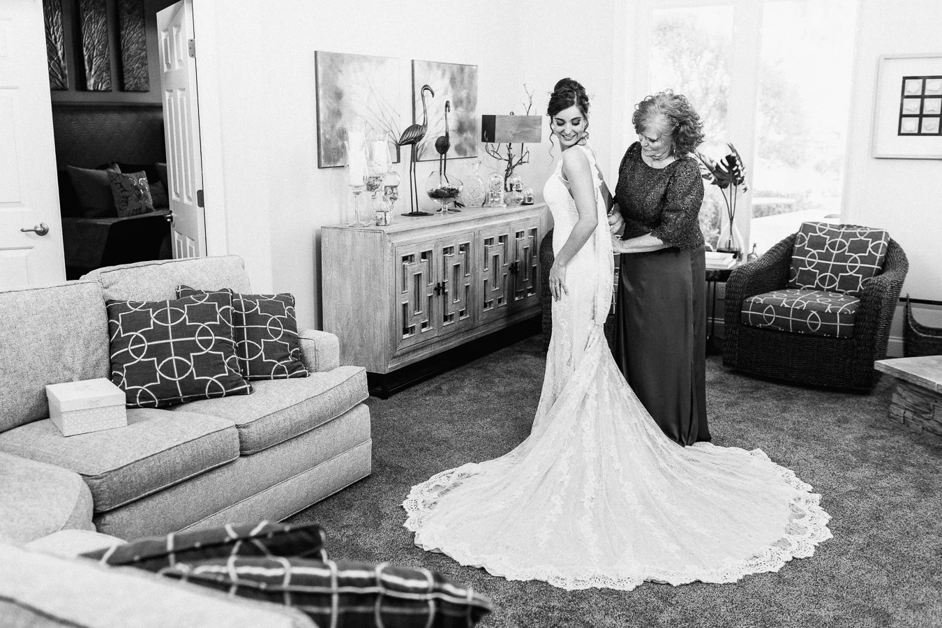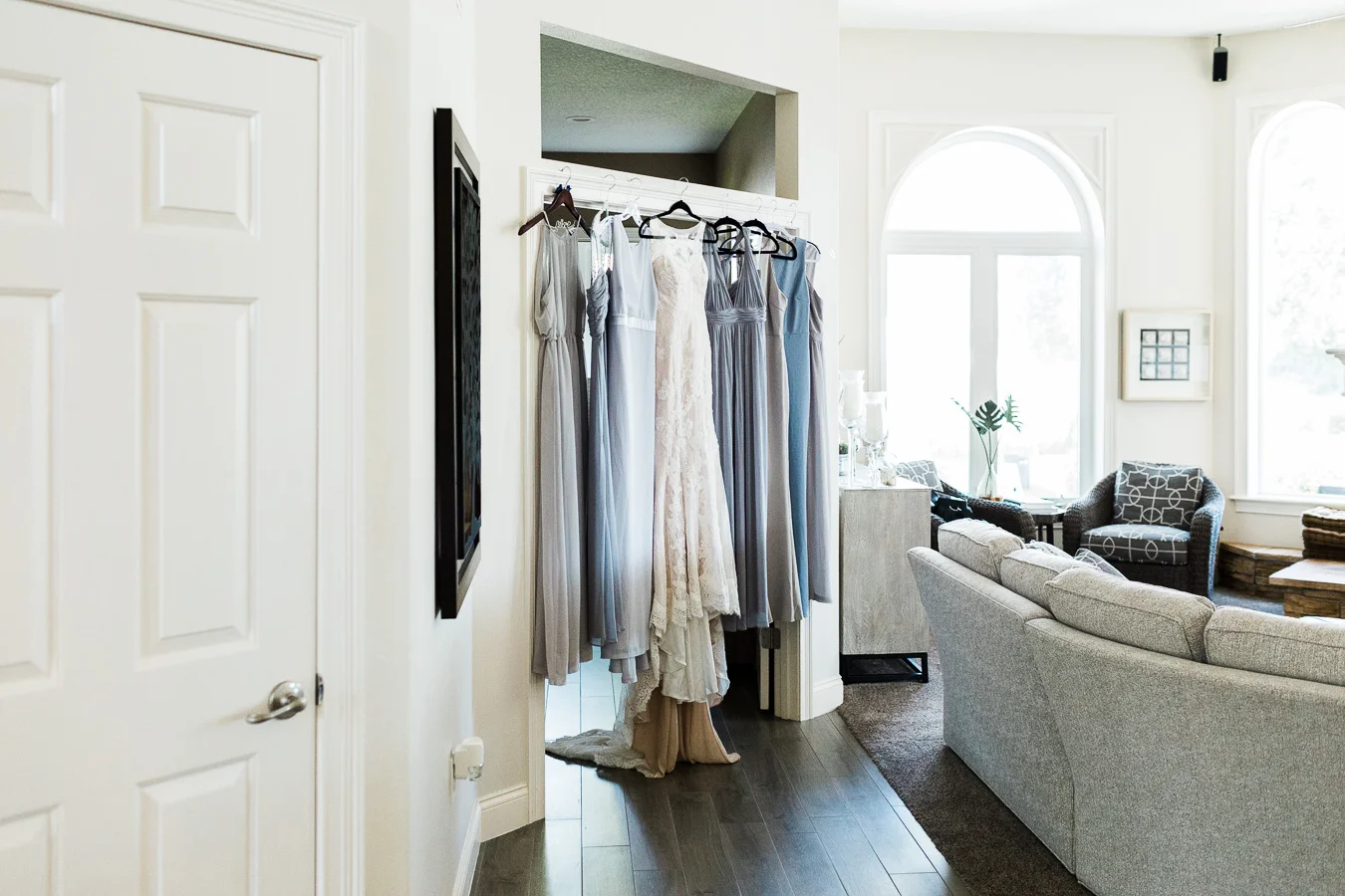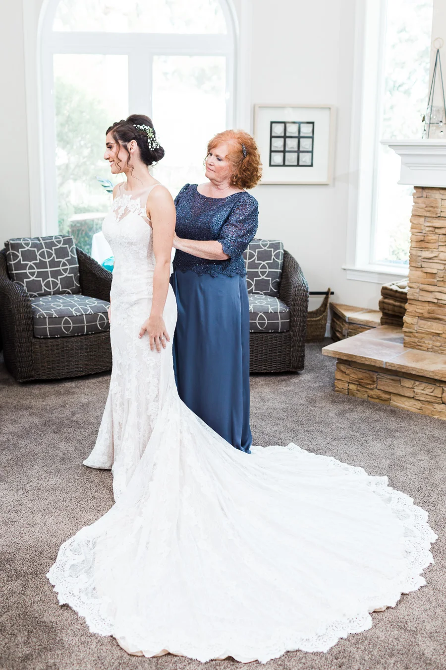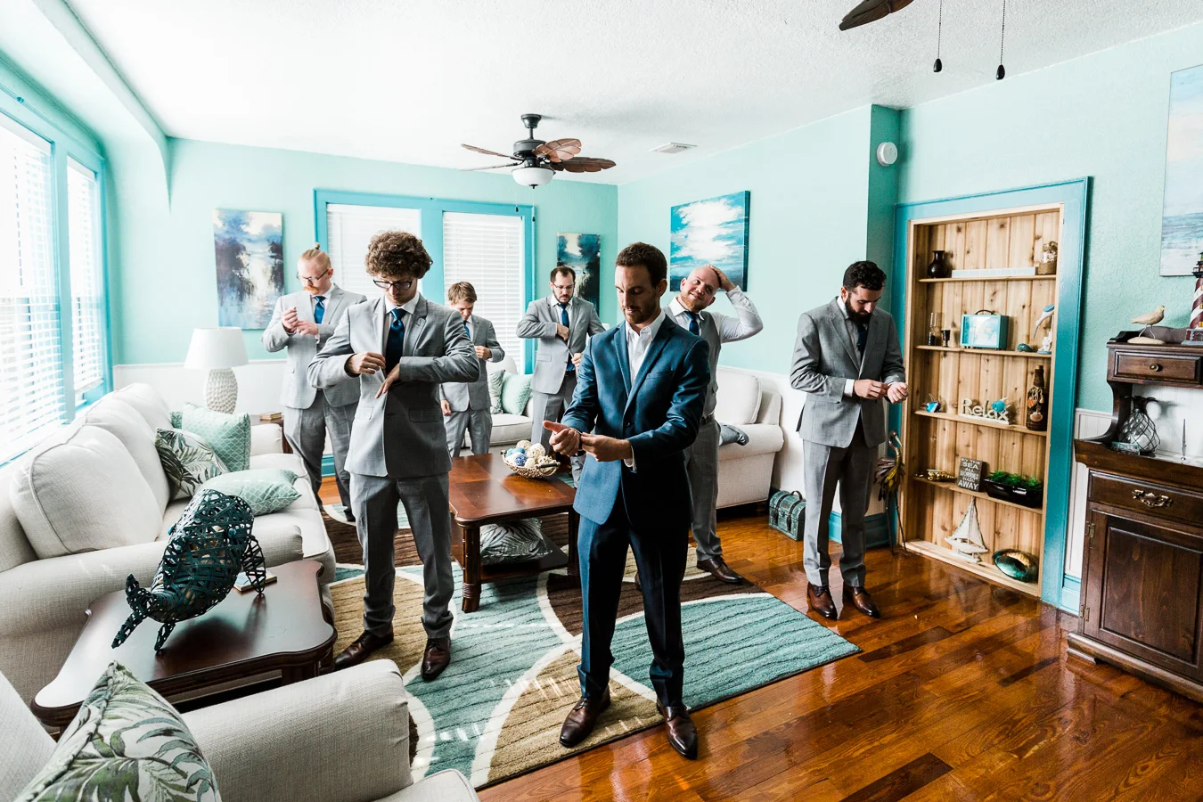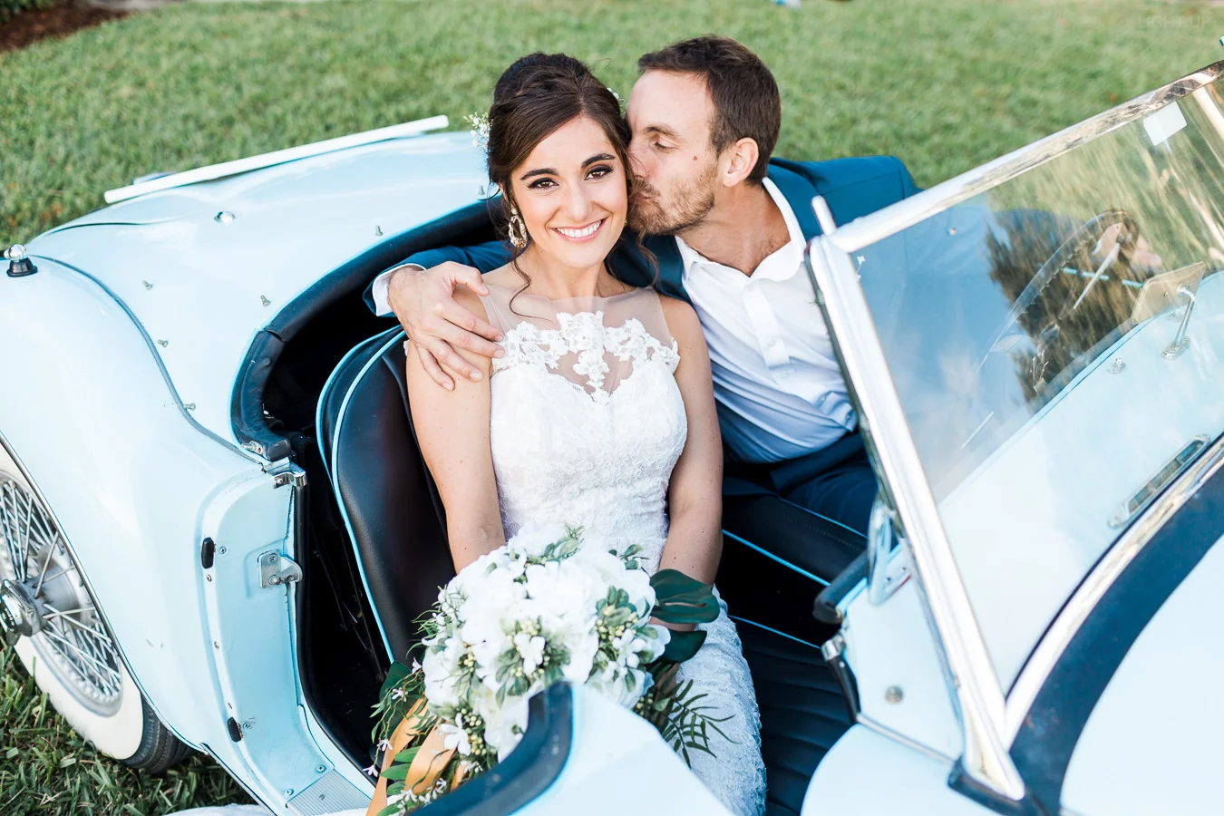 This wedding took place on a private property in Mount Dora that had a gorgeous lawn lined up with a beautiful hedge and trees. When we do a first-look; we simply positioned the groom where we know we are going to capture beautiful photos because the background is free of distractions and the lighting is coming from the best angle. Once we give the bride the “go ahead” nod, we try to stay out of the way to let the moment unfold organically as we watch and document it with our cameras. We don’t interrupt this moment or stage any movements, because this is a real moment charged with real emotion. And just like that, the first-look is over in a few blinks. For many couples, this moment takes a lot of pressure off from all the planning leading up to this day, so it’s only natural that the portraits to follow will be a lot of fun for the bride and groom. In this case, Robin and Tom did made it easy for us to photograph stunning wedding photos around the property followed by the bridal party photos and family portraits.