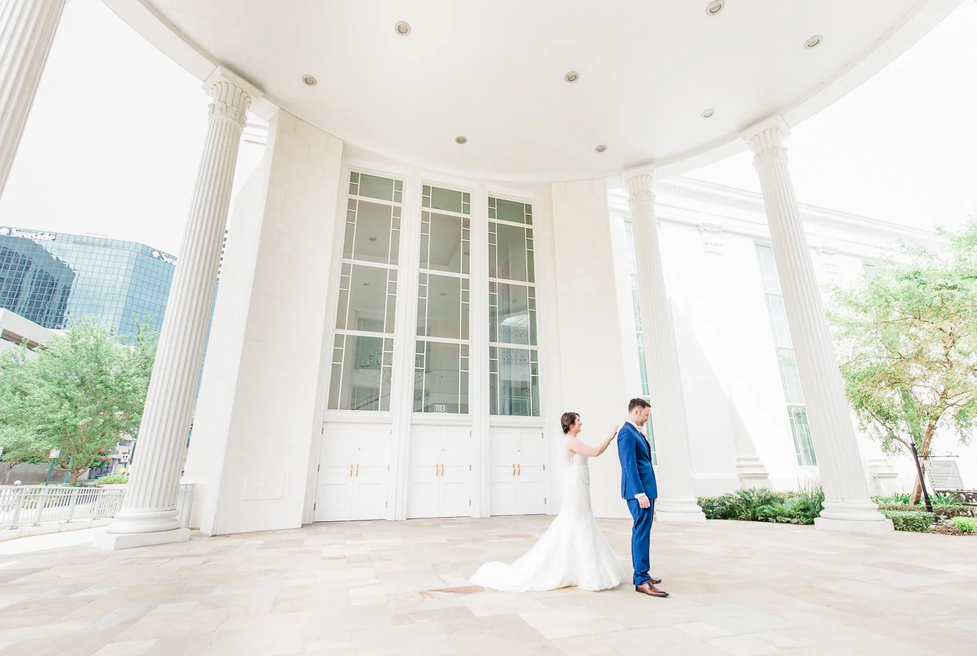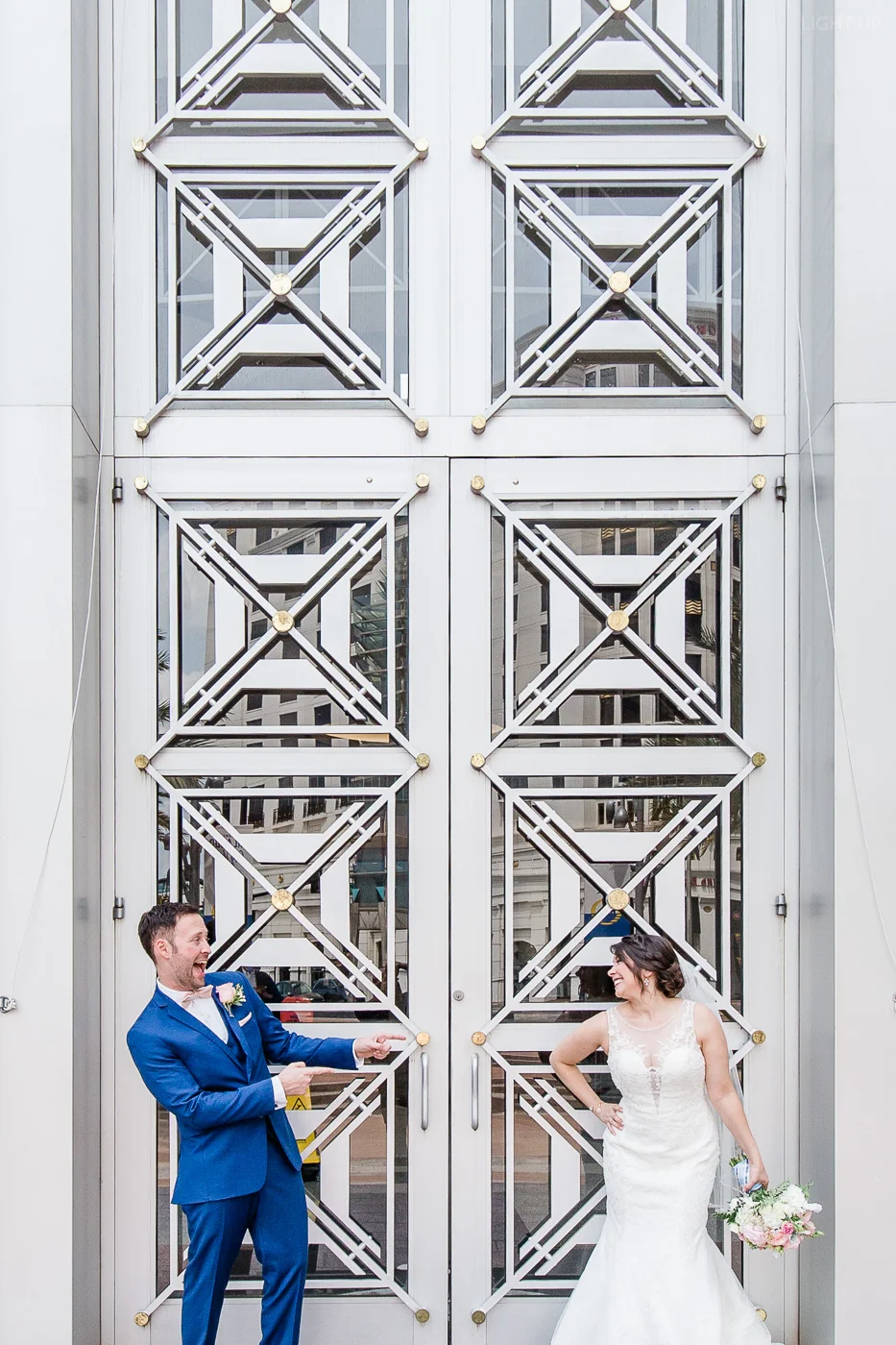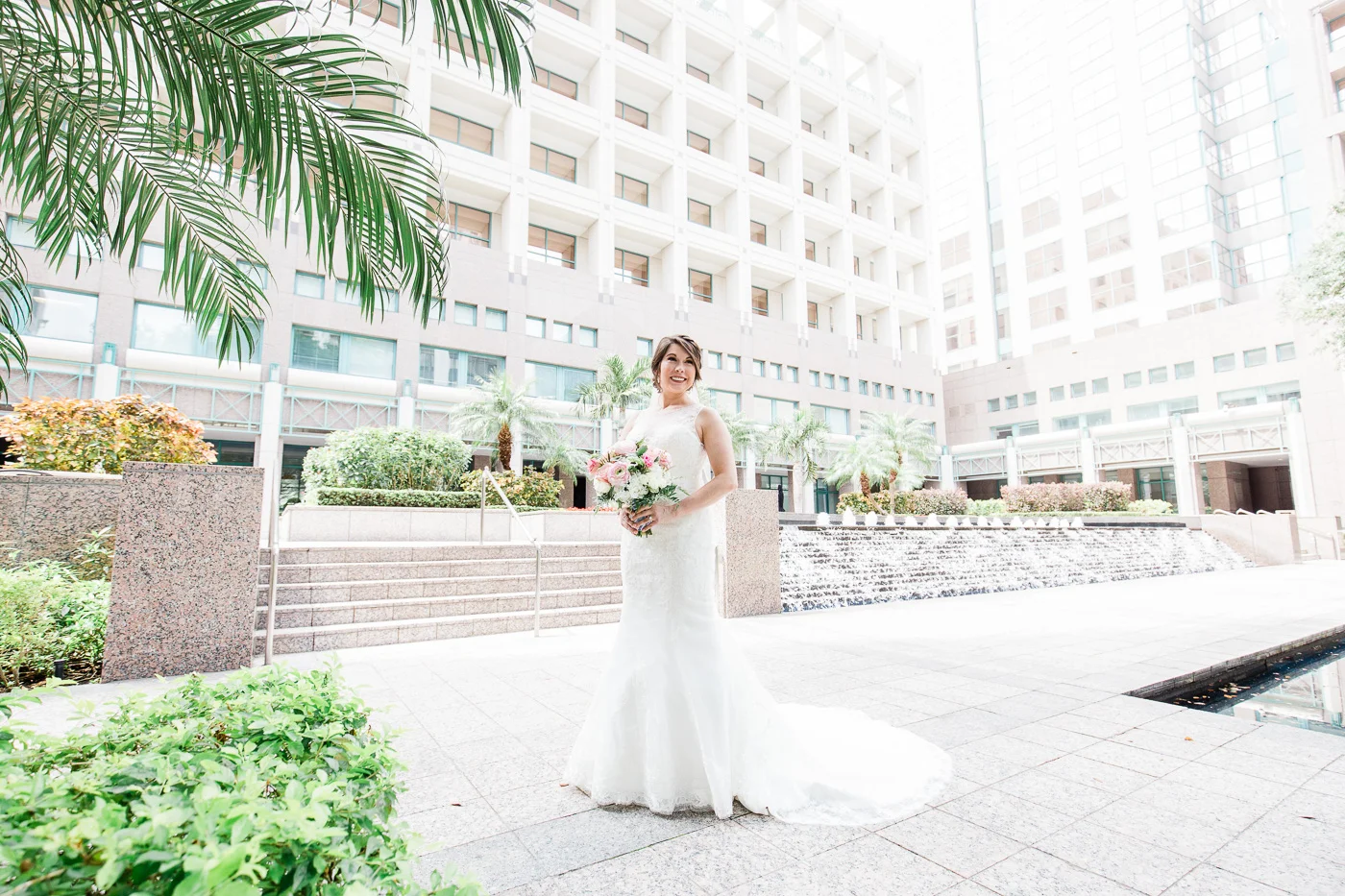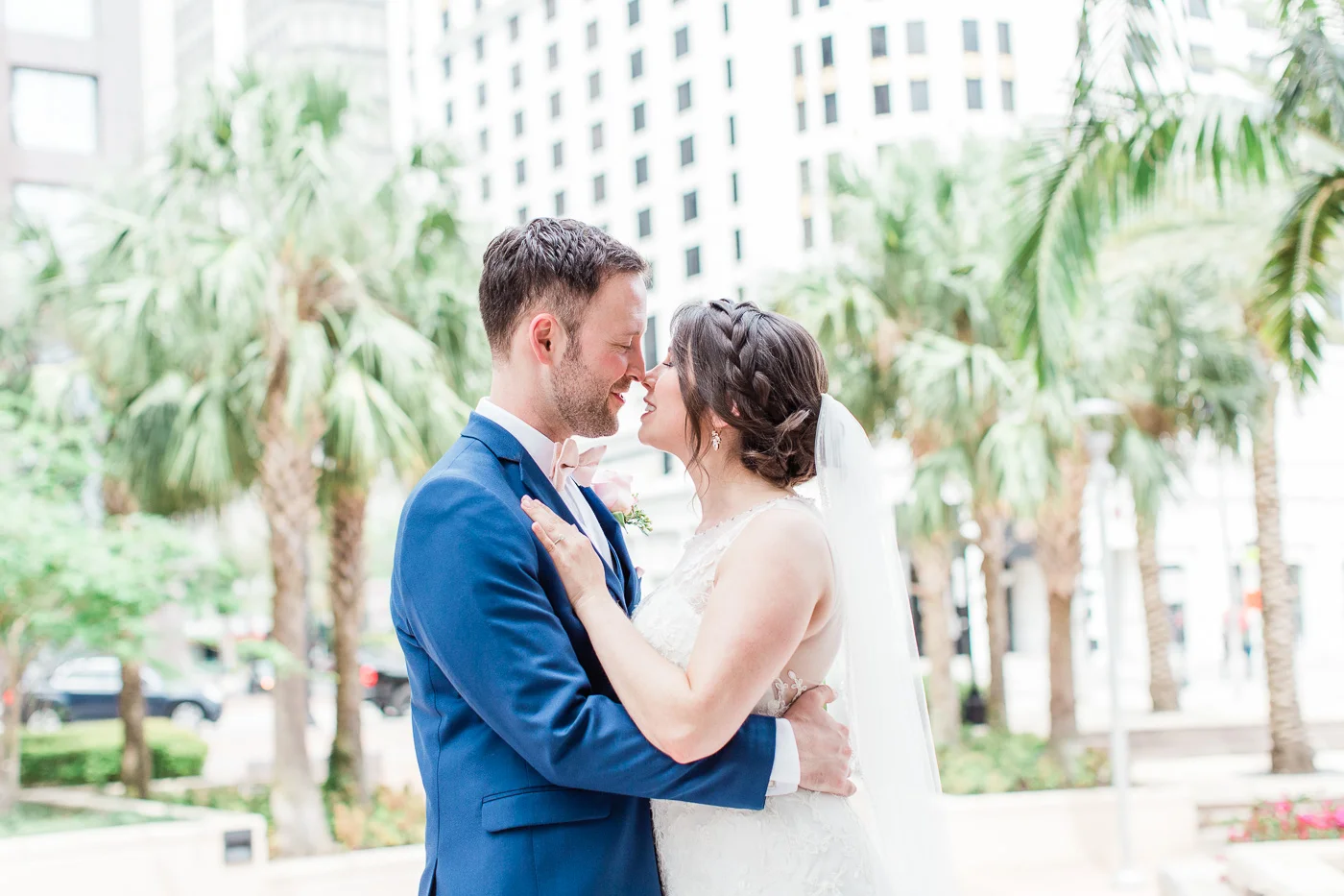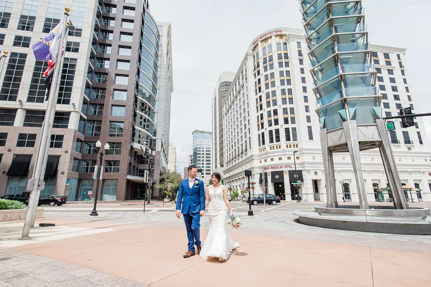 It was truly an honor that Elizabeth picked us out of over 50 local wedding photographers in the Orlando area that replied to her post. After the most amazing engagement session in downtown St Petersburg, we couldn’t wait for their wedding day to arrive. The bride & groom’s getting-ready photos took place a the elegant Grand Bohemian Hotel in downtown Orlando followed by their first-look and a round of lifestyle wedding photos with the city’s skyline in the background.