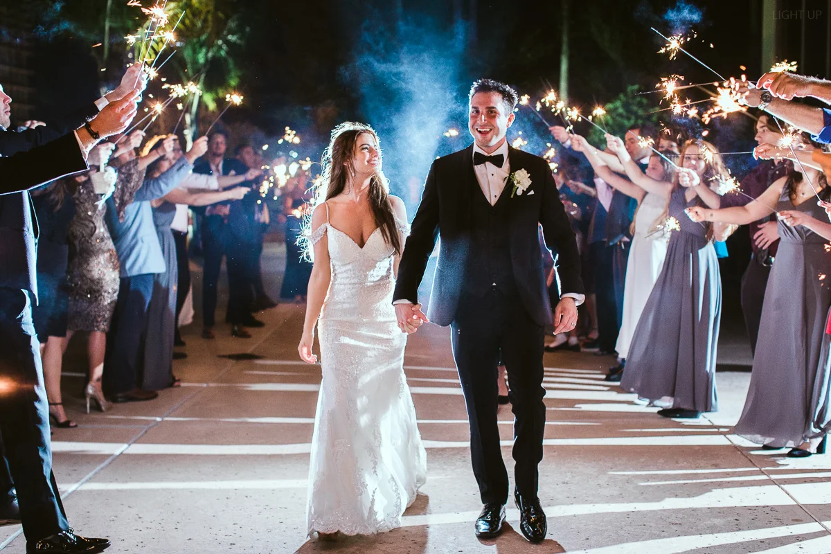 3. The couple needs to be instructed to walk slowly, avoid hunching away from the sparklers, and stay close to each to each other at the hips because otherwise, If they spread out too far while holding hands, the light from the flash will reach the lens directly and cause big-time bright haze. You are basically photographing light at that point and it will look overexposed.