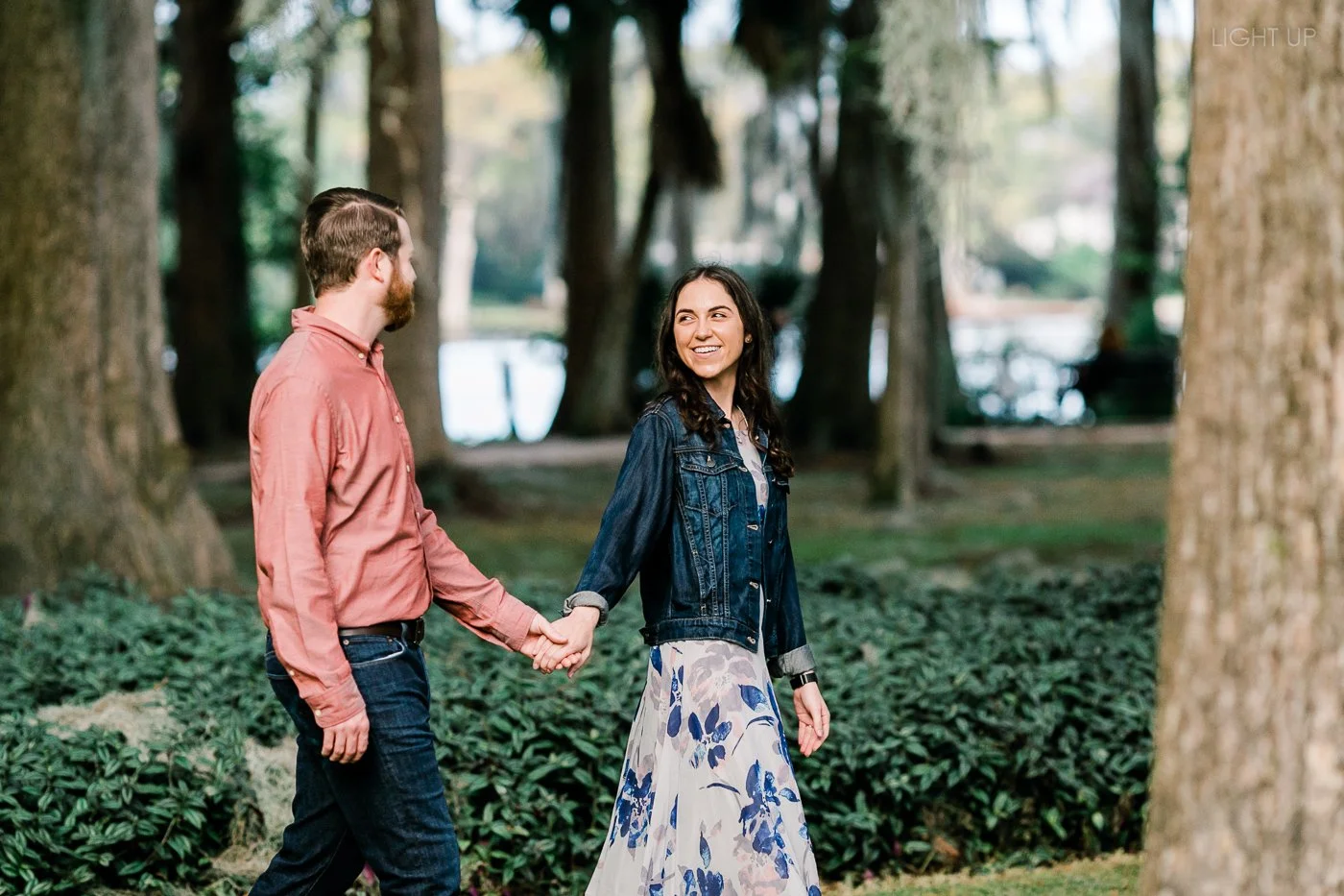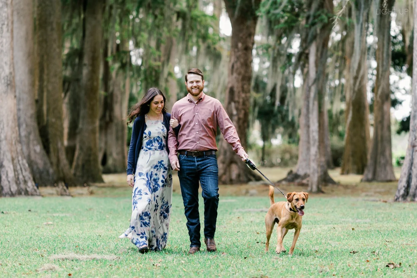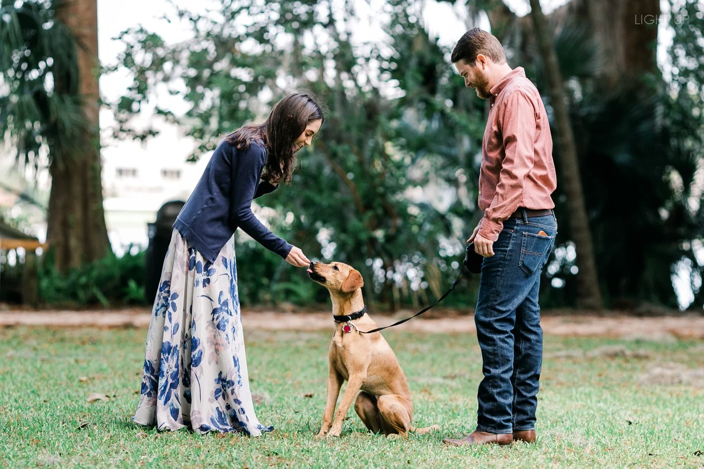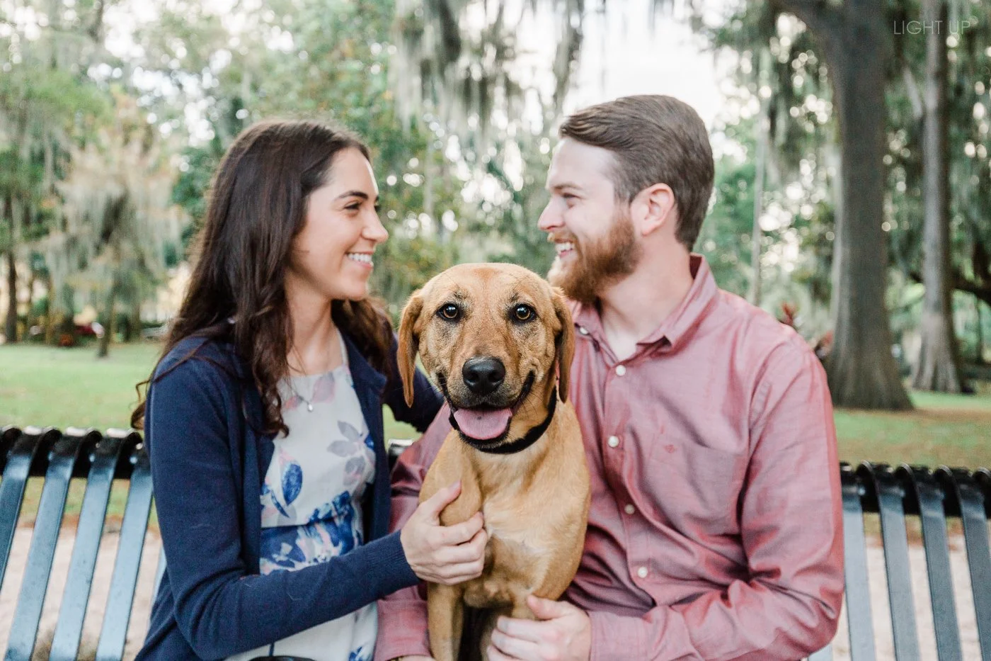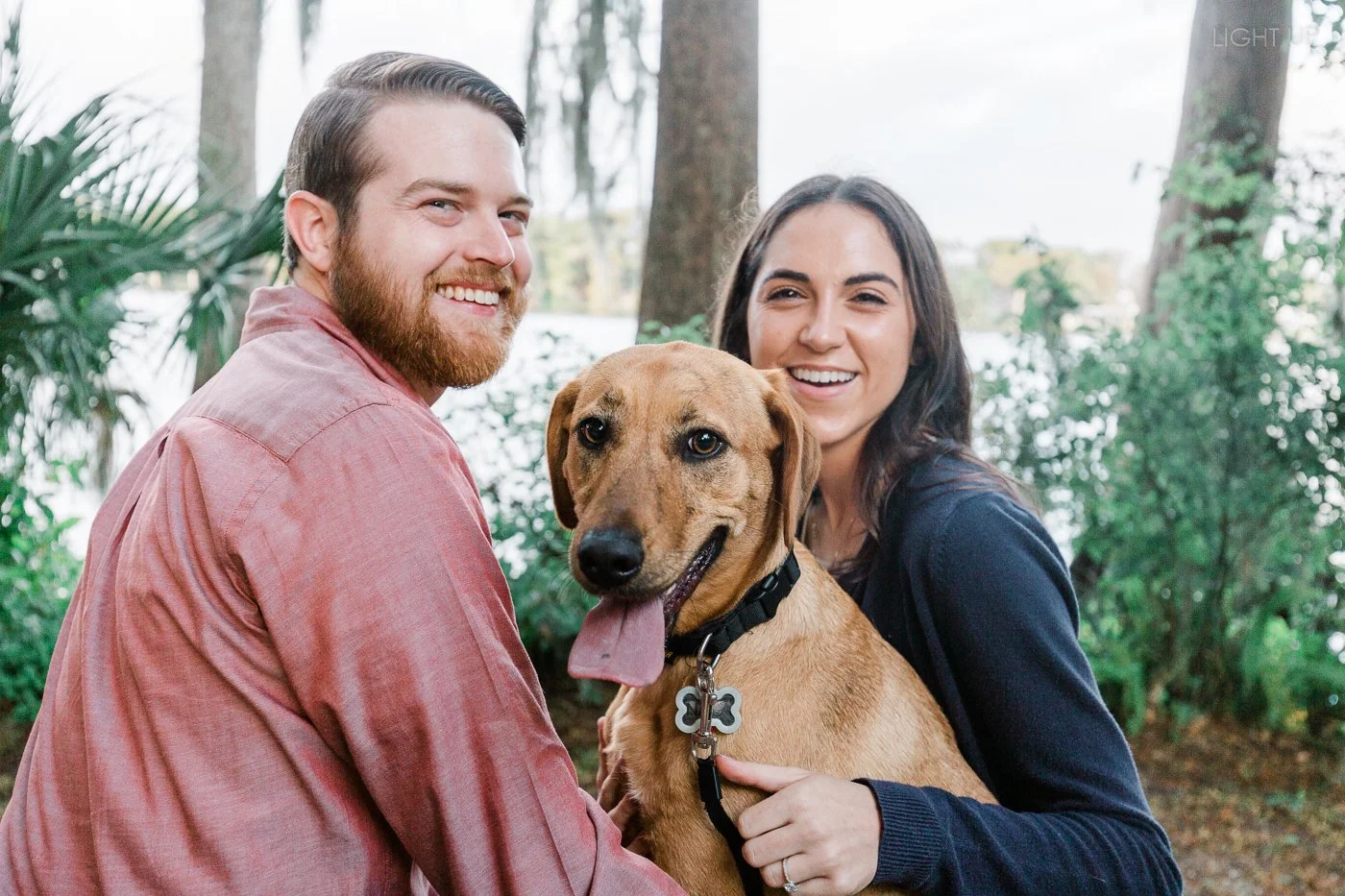 Looking for ideas for engagement photos in Orlando, Florida? Kraft Azalea Gardens in Winter Park, FL is a great location for engagement photos with natural light. There are tall trees, a lake, a dock, a pond, and all the lush greens you want for whimsical engagement photos. Best of all, you can bring your dog if you want to include your puppy in your engagement photos. These are just some of my favorite engagement photos from this couple’s engagement session.