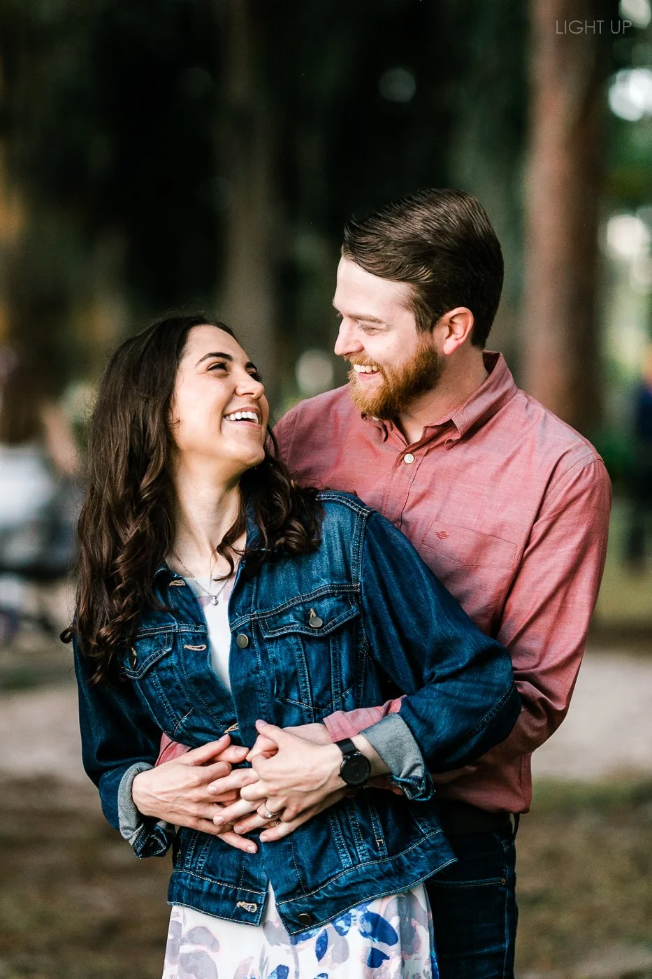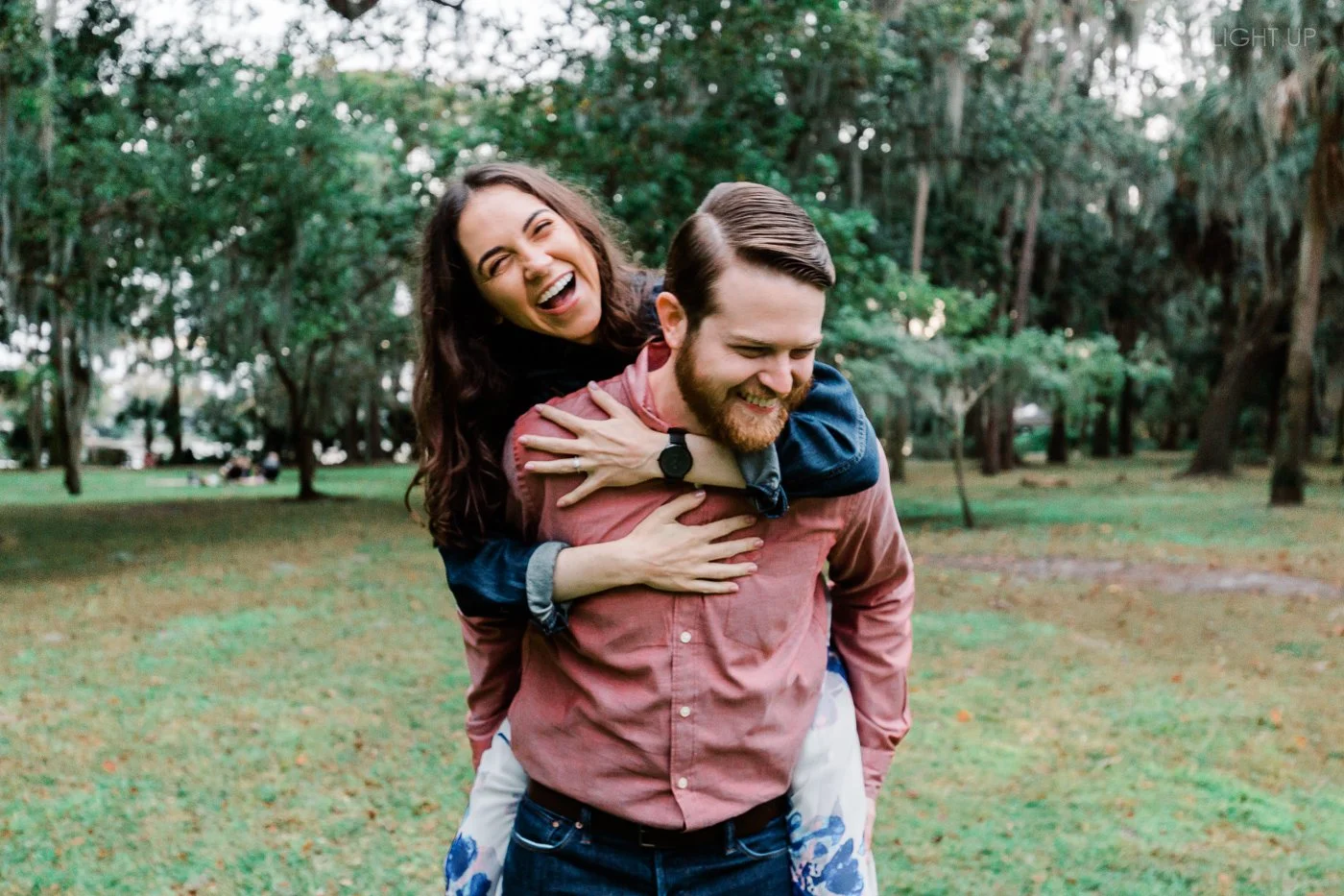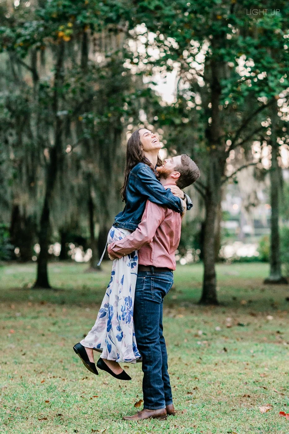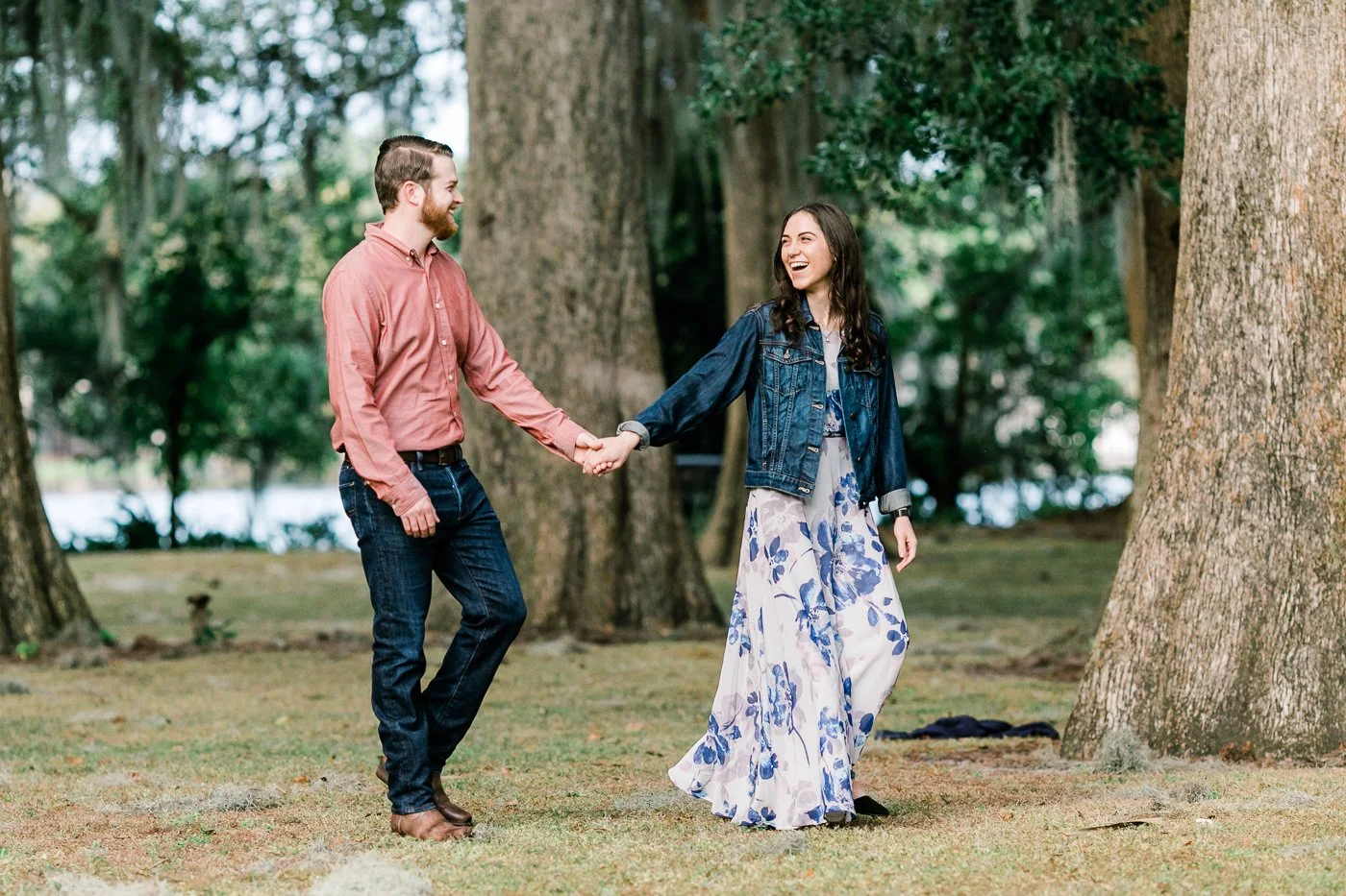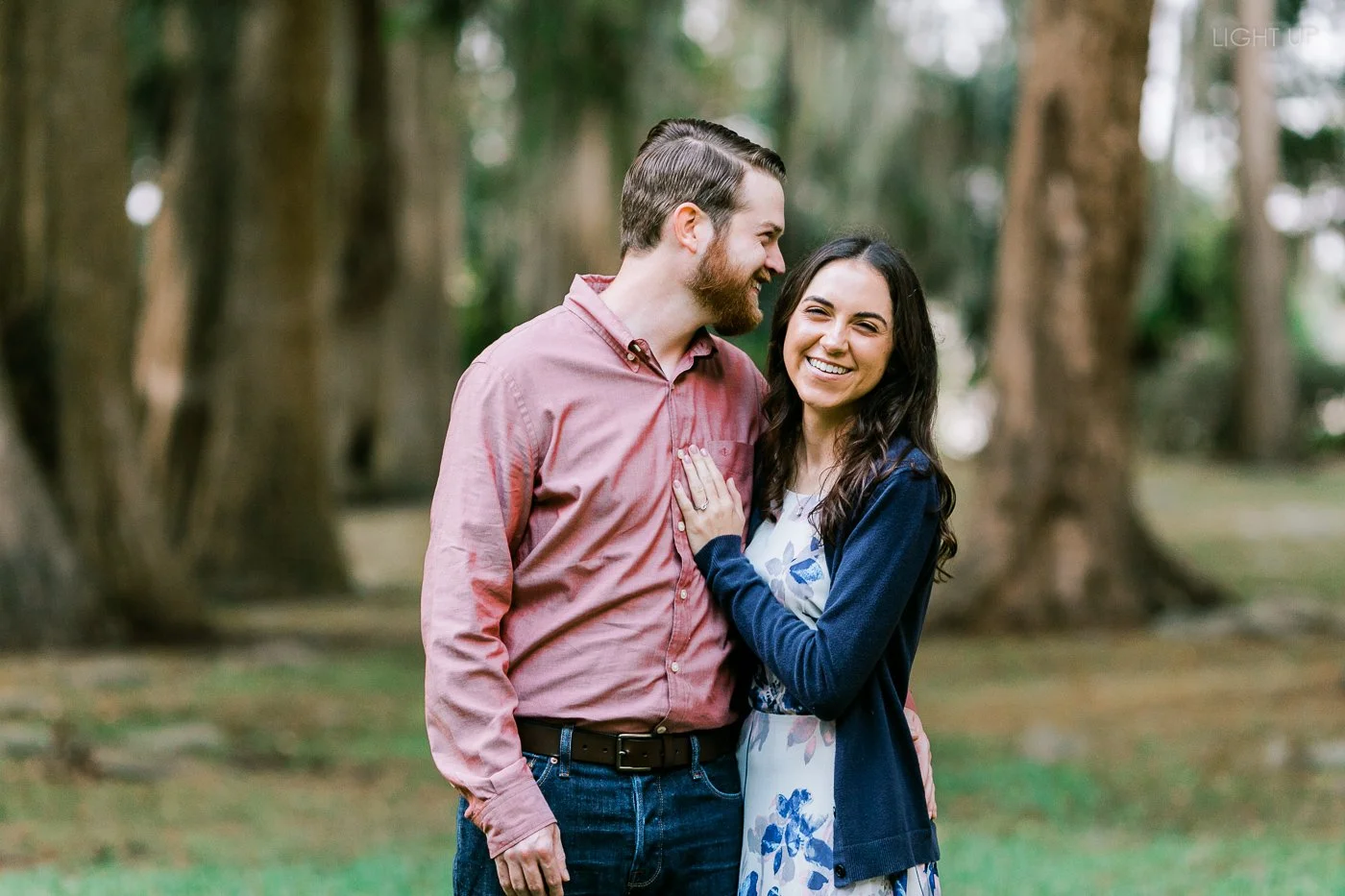 Looking for ideas for engagement photos in Orlando, Florida? Kraft Azalea Gardens in Winter Park, FL is a great location for engagement photos with natural light. There are tall trees, a lake, a dock, a pond, and all the lush greens you want for whimsical engagement photos. Best of all, you can bring your dog if you want to include your puppy in your engagement photos. These are just some of my favorite engagement photos from this couple’s engagement session.