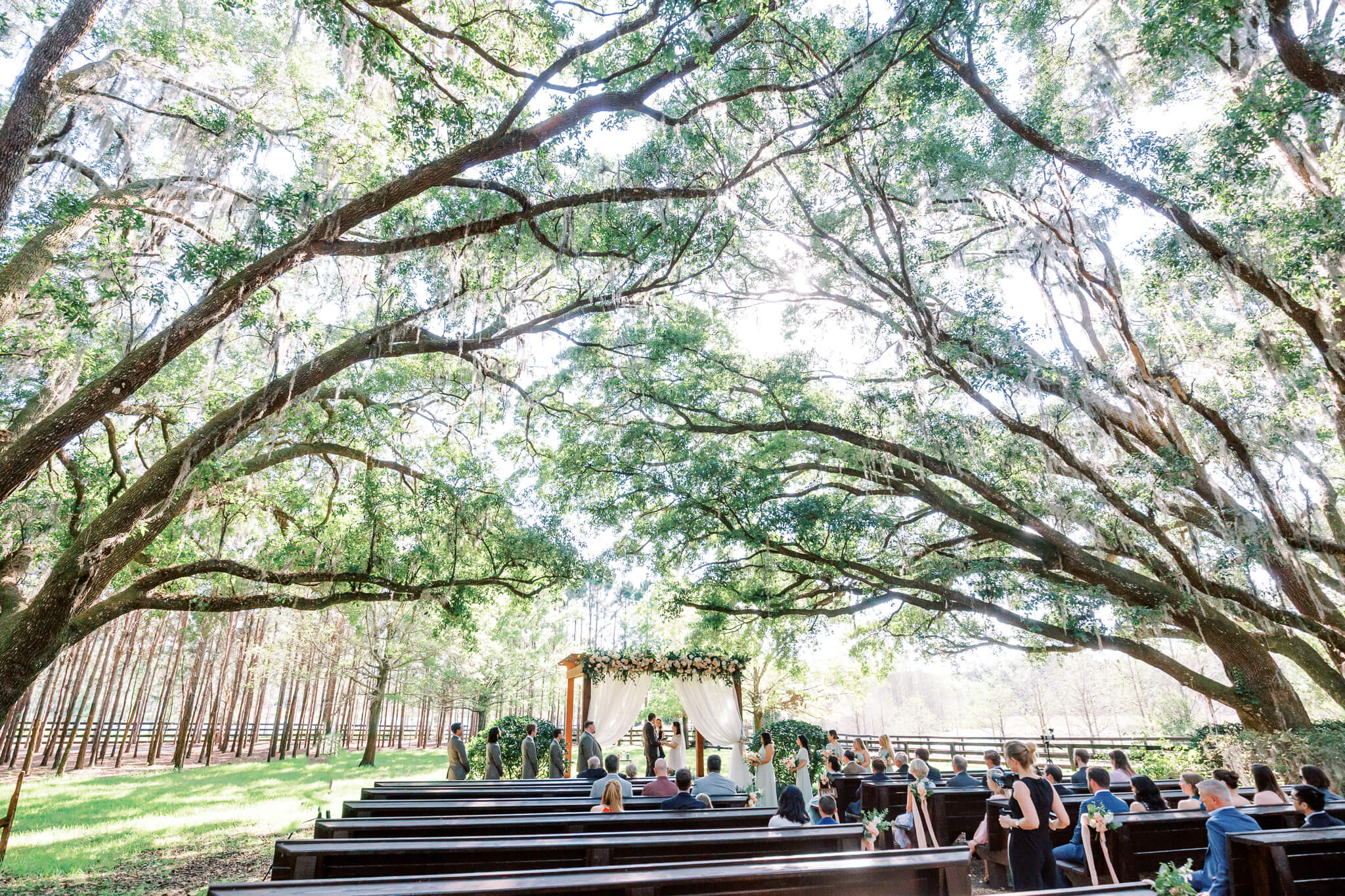 When searching for outdoor wedding venues in Central FL, the ceremony site at Club Lake Venue is one of the most striking locations available. Beneath a breathtaking canopy of large oak trees with hanging moss, couples exchange vows surrounded by lush nature draped in sunlight that cuts gently through the overarching branches. A sense of calm that feels both intimate and grand. This outdoor ceremony space offers a timeless, nature-forward setting that photographs beautifully at any time, making it ideal for couples seeking an elegant yet outdoor wedding ceremony. As a wedding photographer, this ceremony site consistently creates beautiful moments that carry joy, love, and genuine connection; framed by one of the most impressive natural backdrops available.