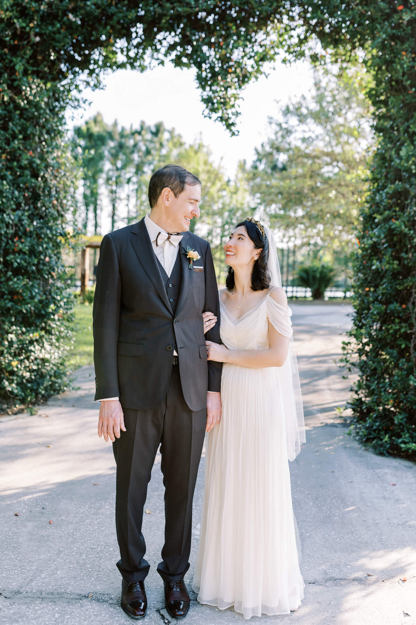 Club Lake Venue offers a variety of backdrops all within a short walk from one another. Couples can have the timeless beauty of Florida’s nature beneath impressive moss-draped oak trees, wander through a small but beautiful pine forest, and stroll down the stunning driveway framed by trees on both sides. There’s a whimsical a hedge shaped into an arch like a heart next to a serene lake that provide endless possibilities for candid and documentary-style wedding portraits. This convenient layout ensures that your gallery is filled with lush nature, curated lush gardens, and variety, all while keeping you while keeping your wedding effortless and relaxed.