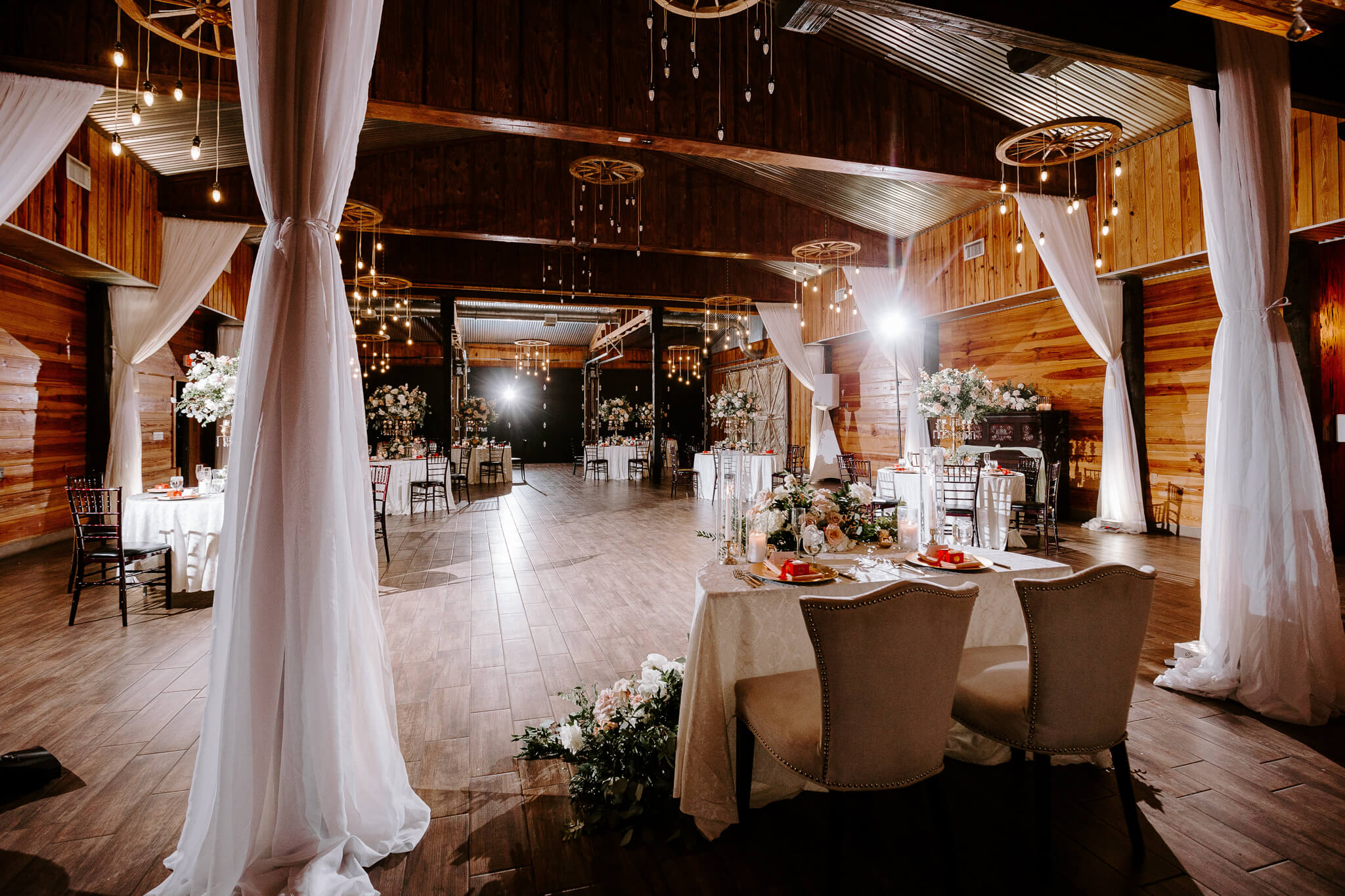 The reception space at Club Lake Venue blends authentic rustic charm with the sophisticated modern comfort of indoor AC. Twinkle lights and elegant chandeliers; this climate-controlled barn features high ceilings and rich wood textures that adapt beautifully to any decor style. The dance floor invites guests to let loose while the barn creates a seamless connection between the cozy, high-end interior and the lush, moss-draped landscape outdoors.